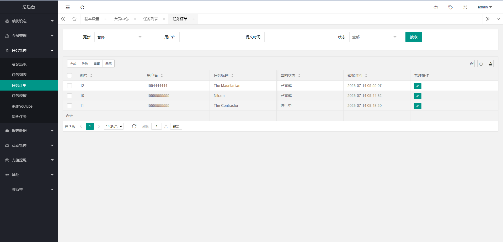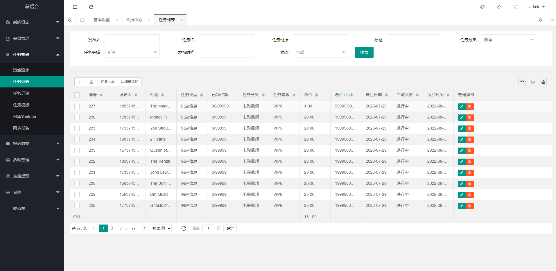 admin 微盘理财 海外多语言电影任务系统/电影投资刷单 玩法简介 ①、会员购买套餐升级 ②、领取任务,看视频提交审核 ③、后台审核任务完成情况,给会员确认审核 ④、会员得到佣金后自行提现 ⑤、会员可分享链接邀请好友注册将获得提成