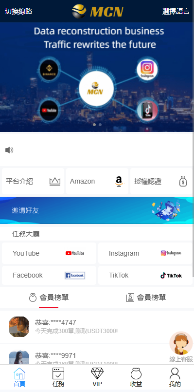 admin 综合系统 多语言海外点赞任务系统/余额宝/国际任务点赞 前端vue开发,后端php的thinkphp框架 多语言带余额宝 玩法简介 ①、会员购买套餐升级 ②、领取任务,提交截图上传审核 ③、后台审核任务完成情况,给会员确认佣金 ④、会员得到佣金后自行提现 ⑤、会员可分享链接邀请好友注册将获得提成 ⑥、国际多语言(支持定制增加语言和二次开发)