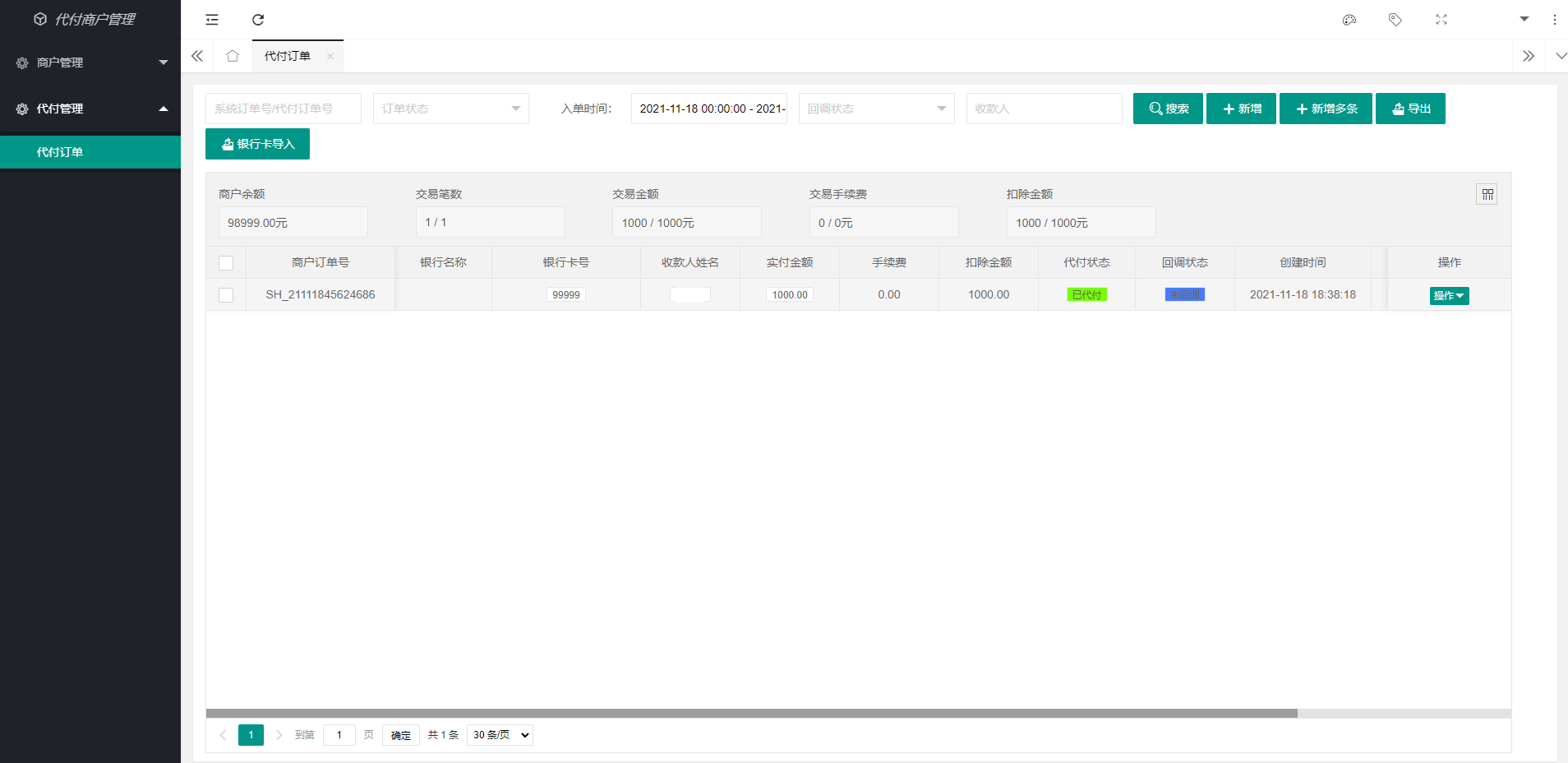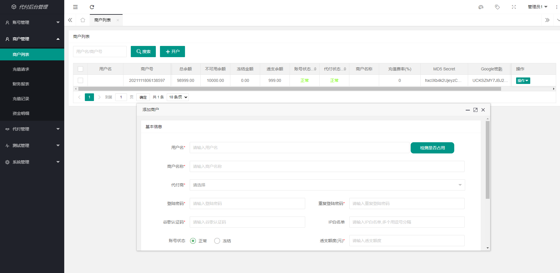 admin 综合系统 银行卡代付系统、人工代付支付系统、支付、代理、商户、支持谷歌验证码 无监控APP 1、纯代付系统 2、支持银行卡手动代付 3、支持单笔 4、后台代付 5、支持登陆白名单和代付白名单 6、支持谷歌验证 7、代付api接口 8、人工代付后台新增语音播报功能
