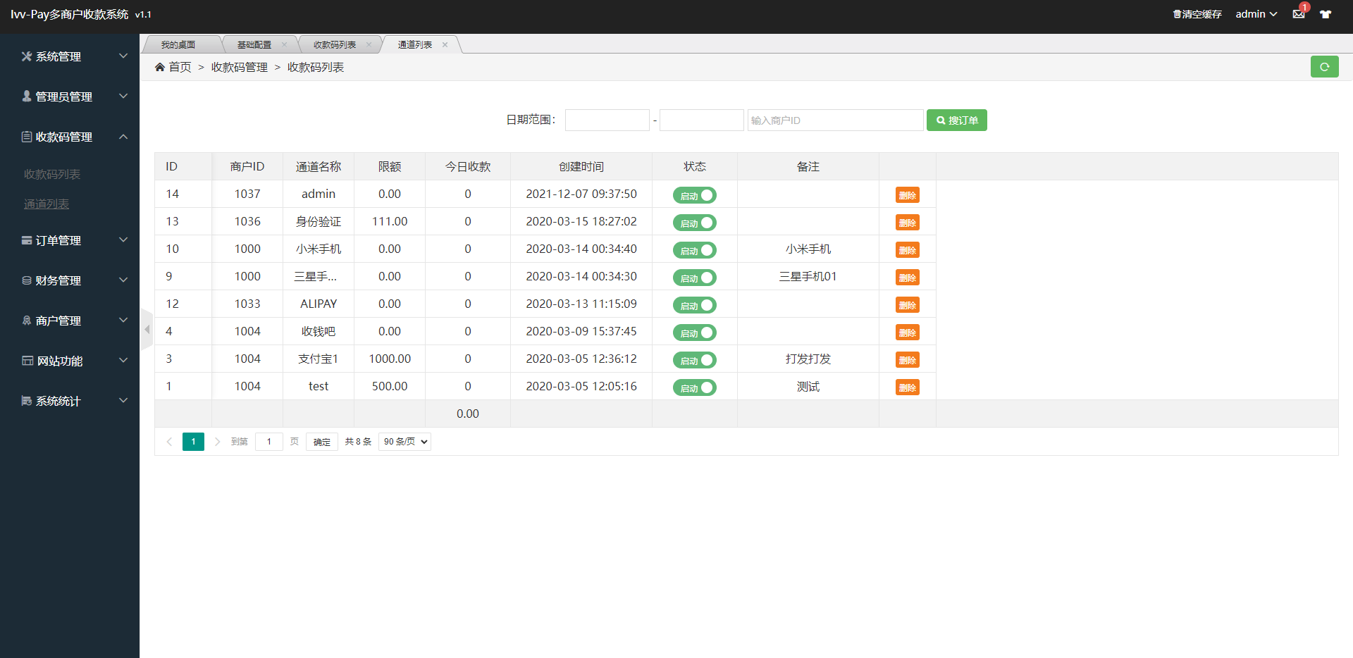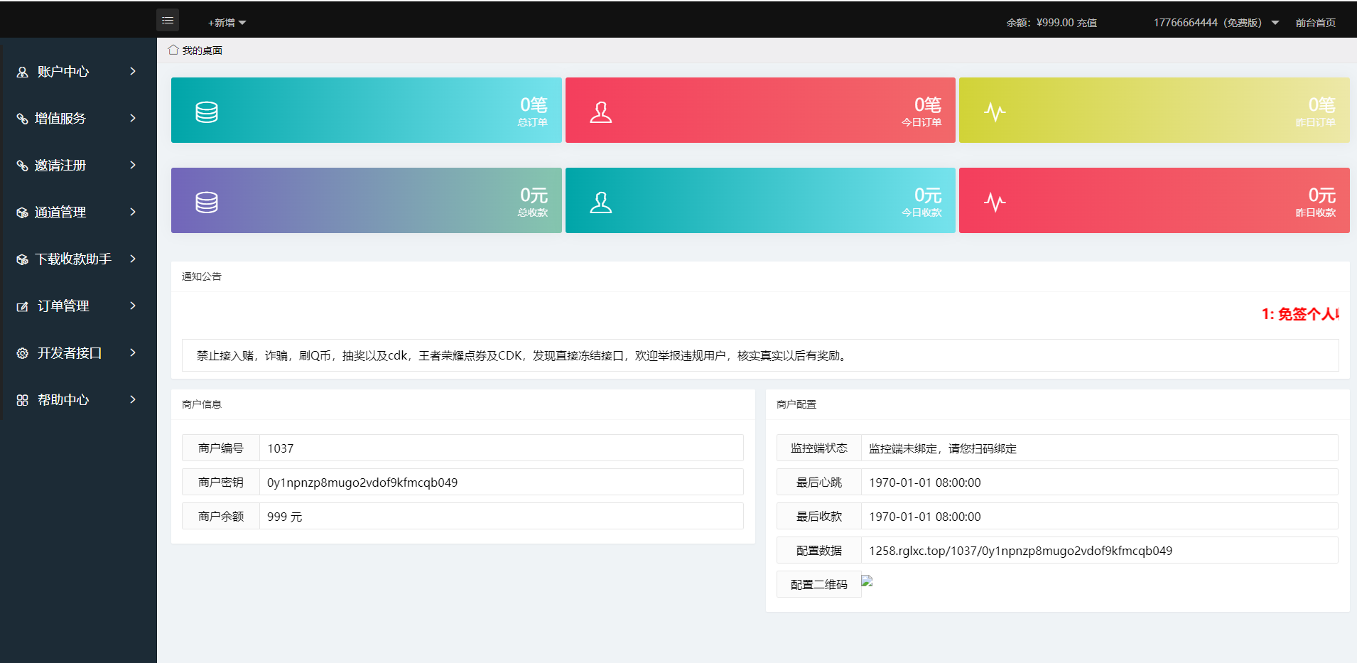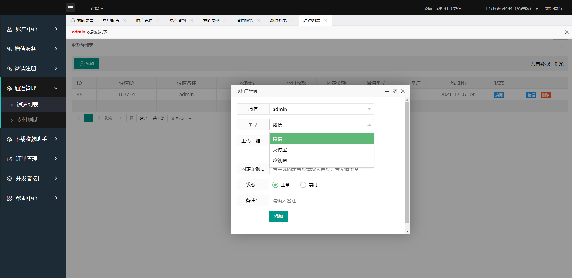 通道支持微信、支付宝、收钱吧通道,支持个码固码轮询支付