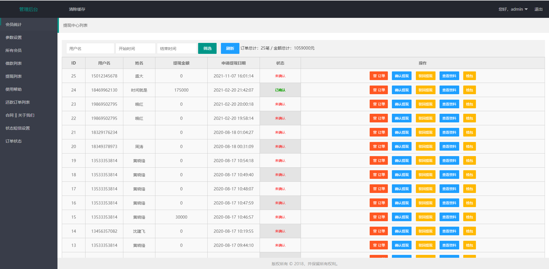 admin 综合系统 经典网贷系统/合同贷款/贷款平台 前台功能: 1.前台提交需要手写签名 2.前台显示合同 3.新增贷款风险信息 4.客户一键点击进去可以聊天 5.贷款钱包直接点击全整金额提现等 后台功能: 1.后台登录选择业务员或者管理员登录 2.新增秒搭建台子,每个业务员都有一个台子,业务员用户数据台子相互看不到,管理员可以看到全部 3.可以单独设置用户额度和登记 4.后台控制钱包的充值和加款 5.新增各种截图