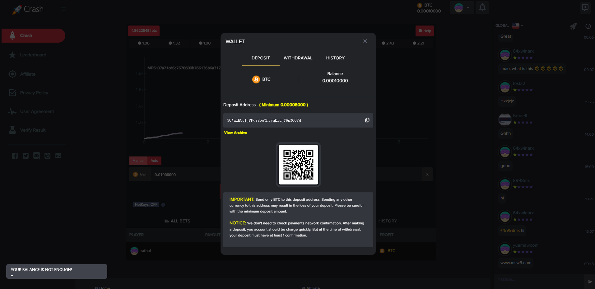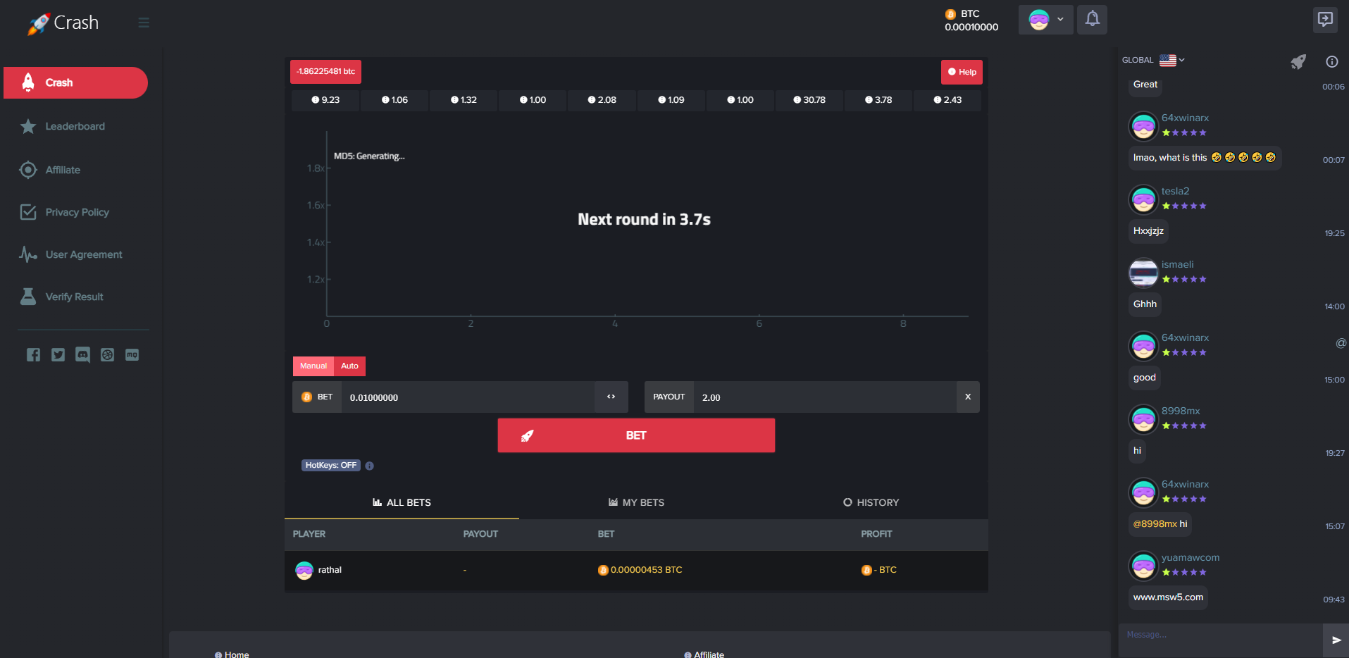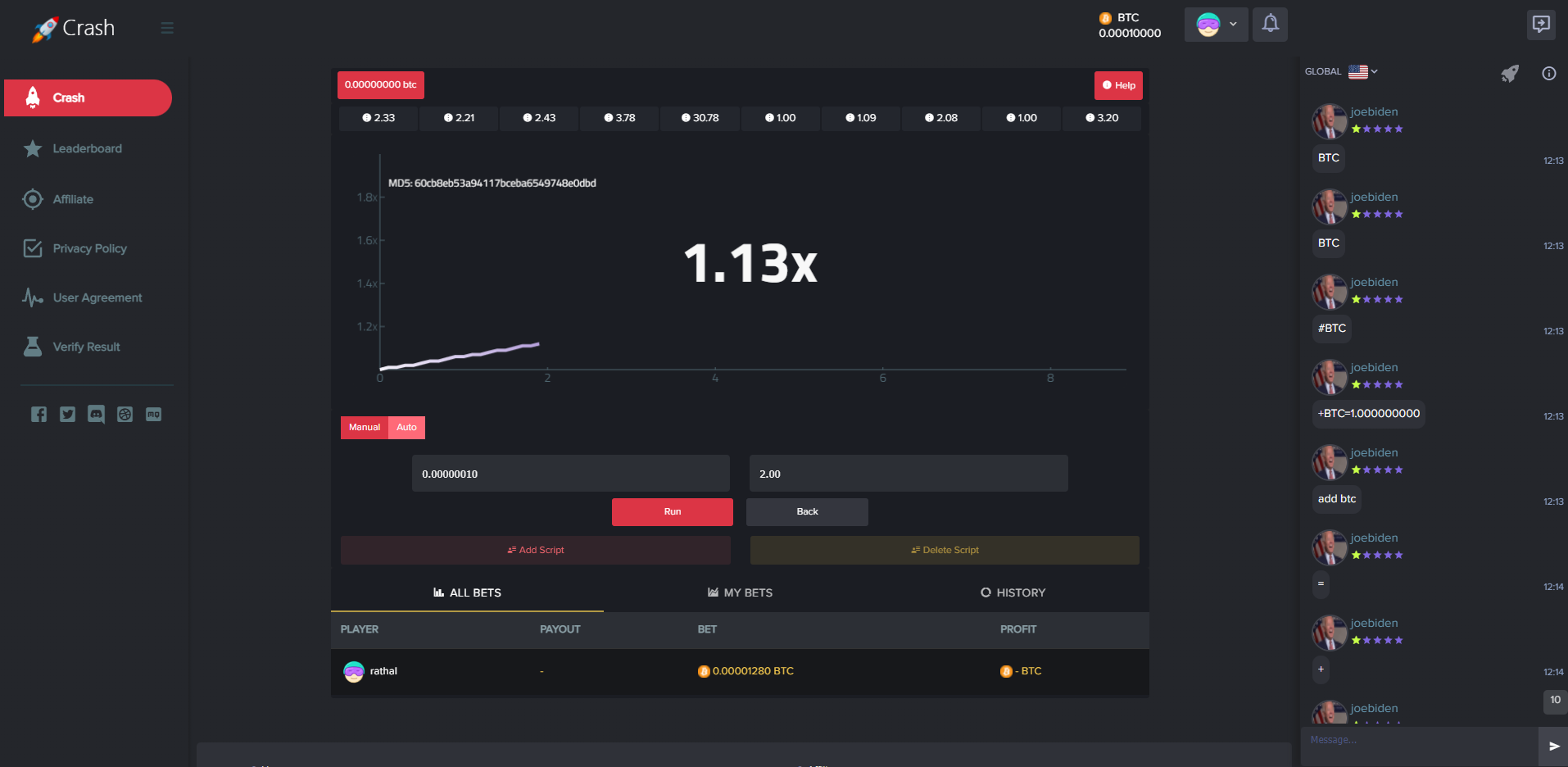 admin 菠菜彩票 海外爆点游戏/竞猜下注游戏/带聊天室/机器人/BTC充值 海外爆点游戏/竞猜下注游戏/带聊天室/机器人/BTC充值 一款海外爆点游戏,游戏分为三端:前端、API、后端 游戏支持BTC充值,附带聊天室、支持后台添加机器人