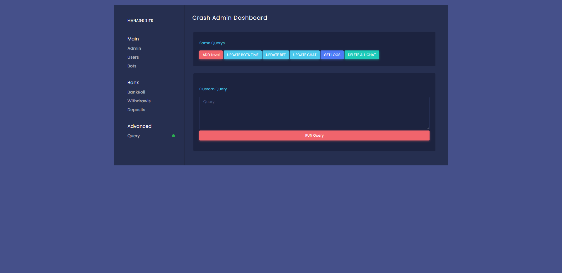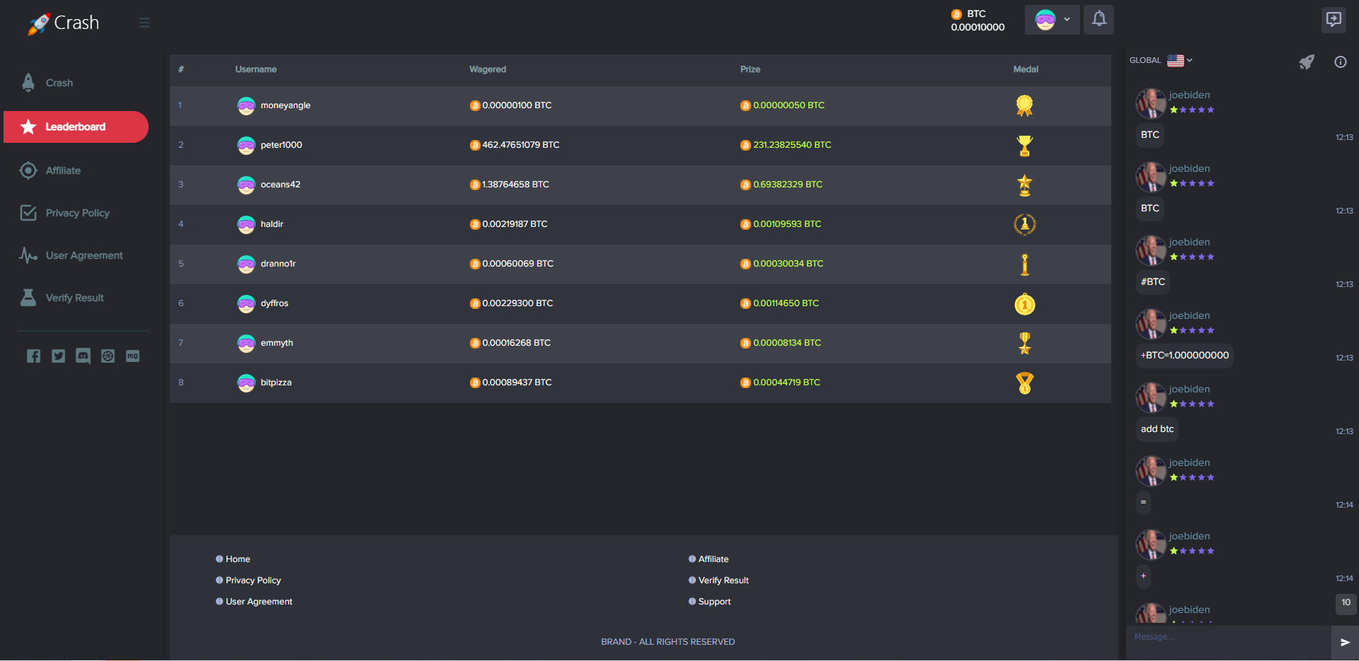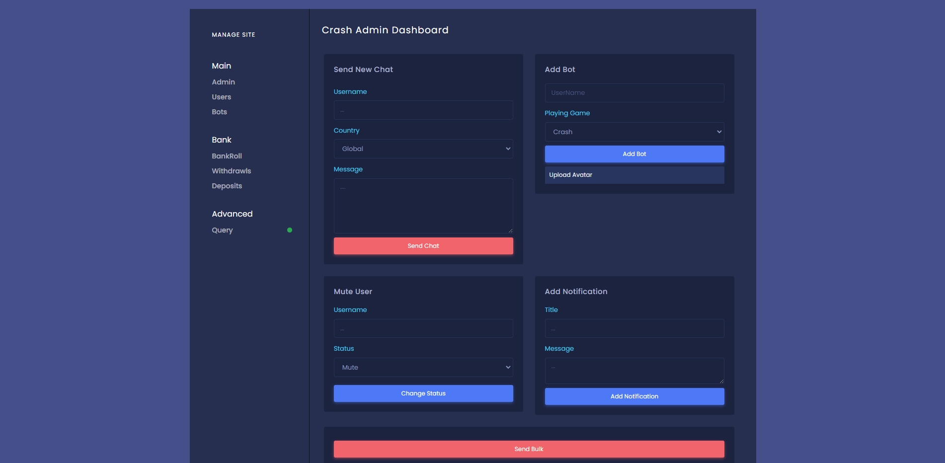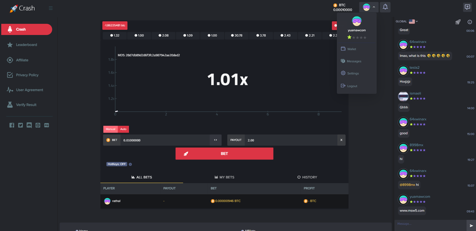 admin 菠菜彩票 海外爆点游戏/竞猜下注游戏/带聊天室/机器人/BTC充值 海外爆点游戏/竞猜下注游戏/带聊天室/机器人/BTC充值 一款海外爆点游戏,游戏分为三端:前端、API、后端 游戏支持BTC充值,附带聊天室、支持后台添加机器人