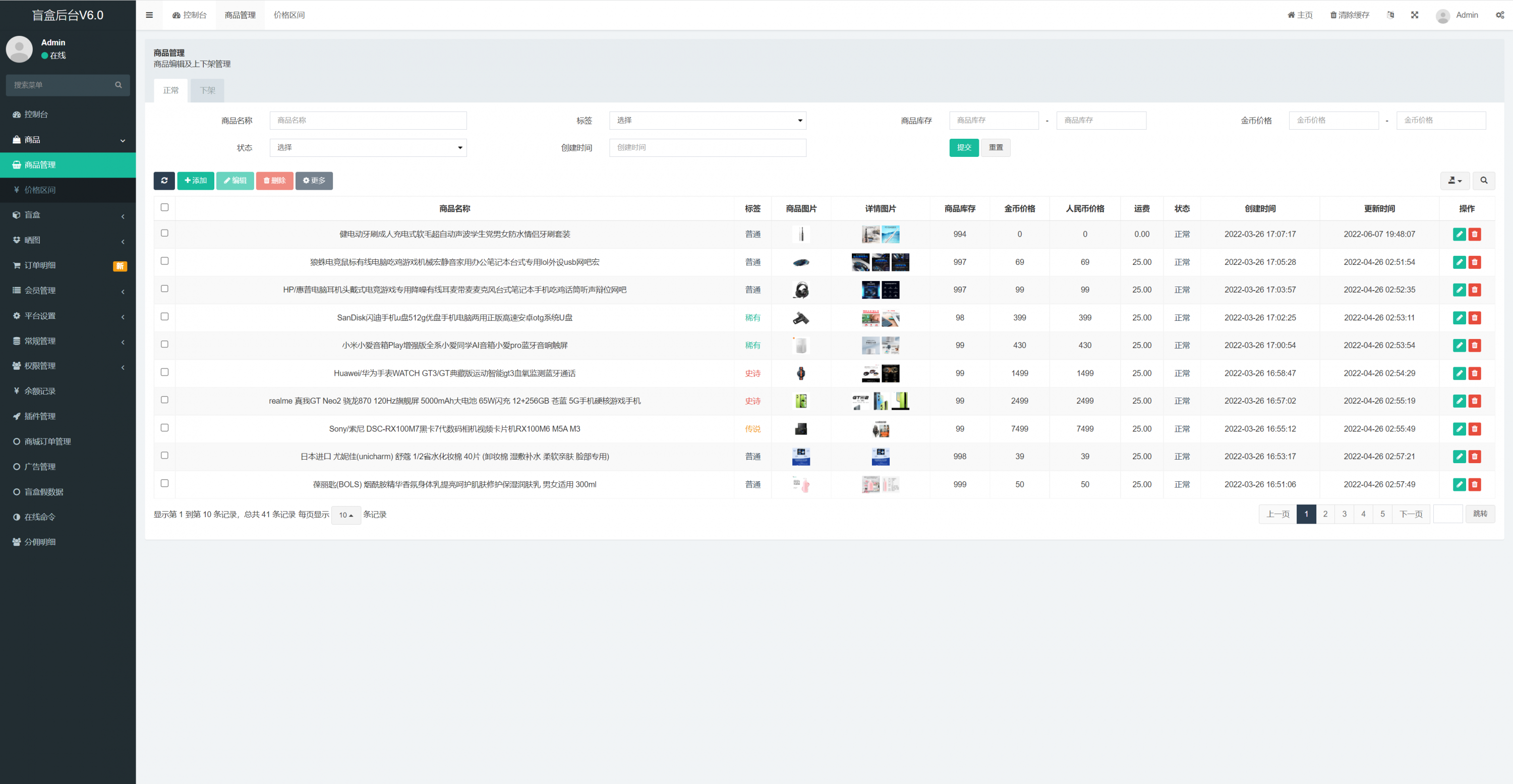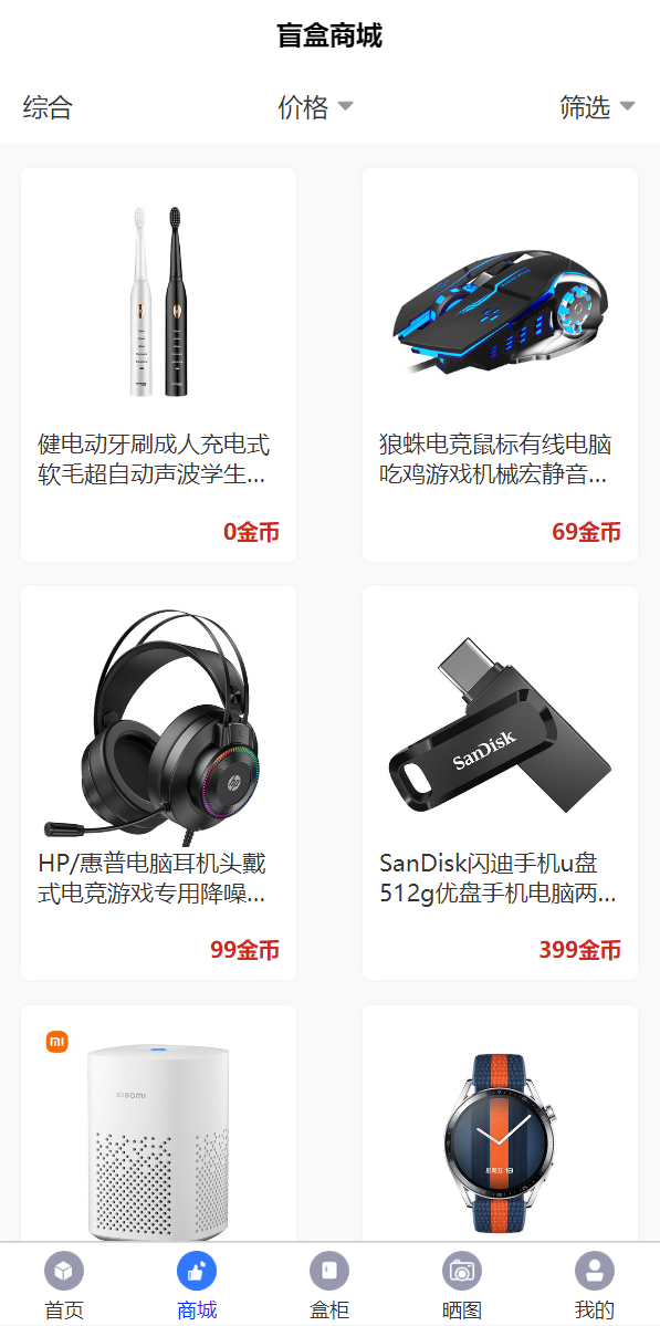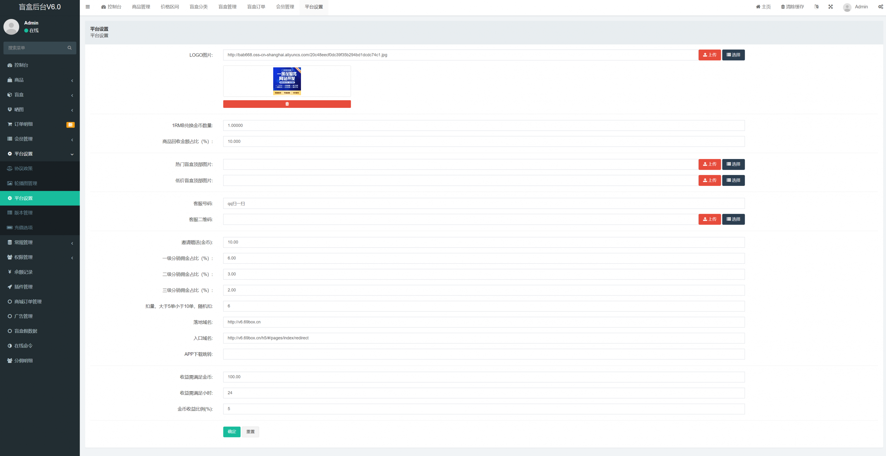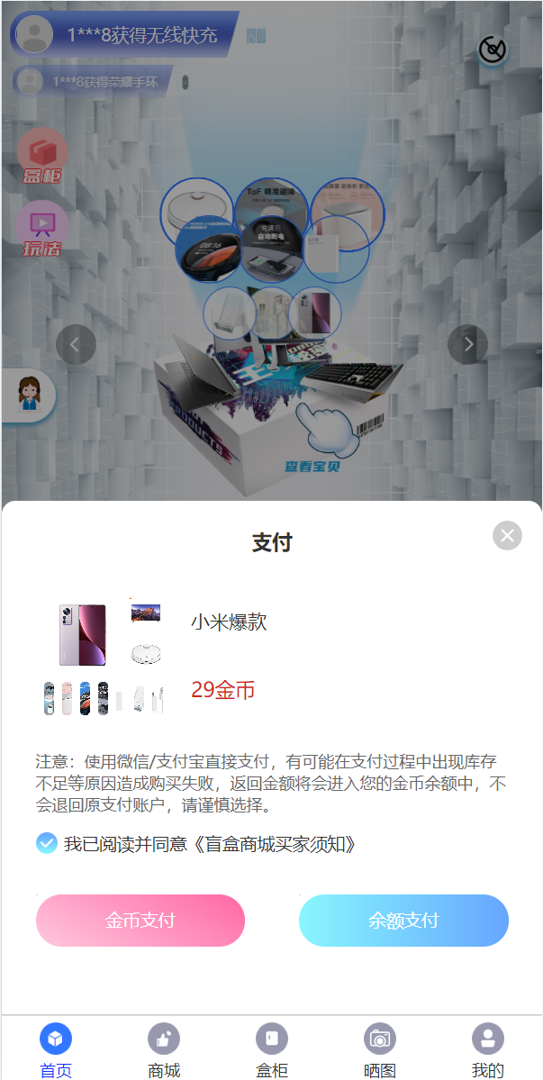 admin 商城刷单 综合系统 盲盒V6.0/H5盲盒商城交易平台/盲盒抽奖系统 盲盒V6.0/H5盲盒商城交易平台/盲盒抽奖系统 盲盒商城V6.0更新 1.新增加商城功能:推荐改成商城,后台添加商品,可以用金币购买商品。 2.金币升值功能:满xx 金币数量,累计24小时增加xx 金币,按照后台百分比升值。 3.增加推广赠送金币,赠送金币数量可在后台设置 4.增加外部广告图片展示,可以后台设置跳转链接 5.余额增加提现功能,回收金额可以快速提现