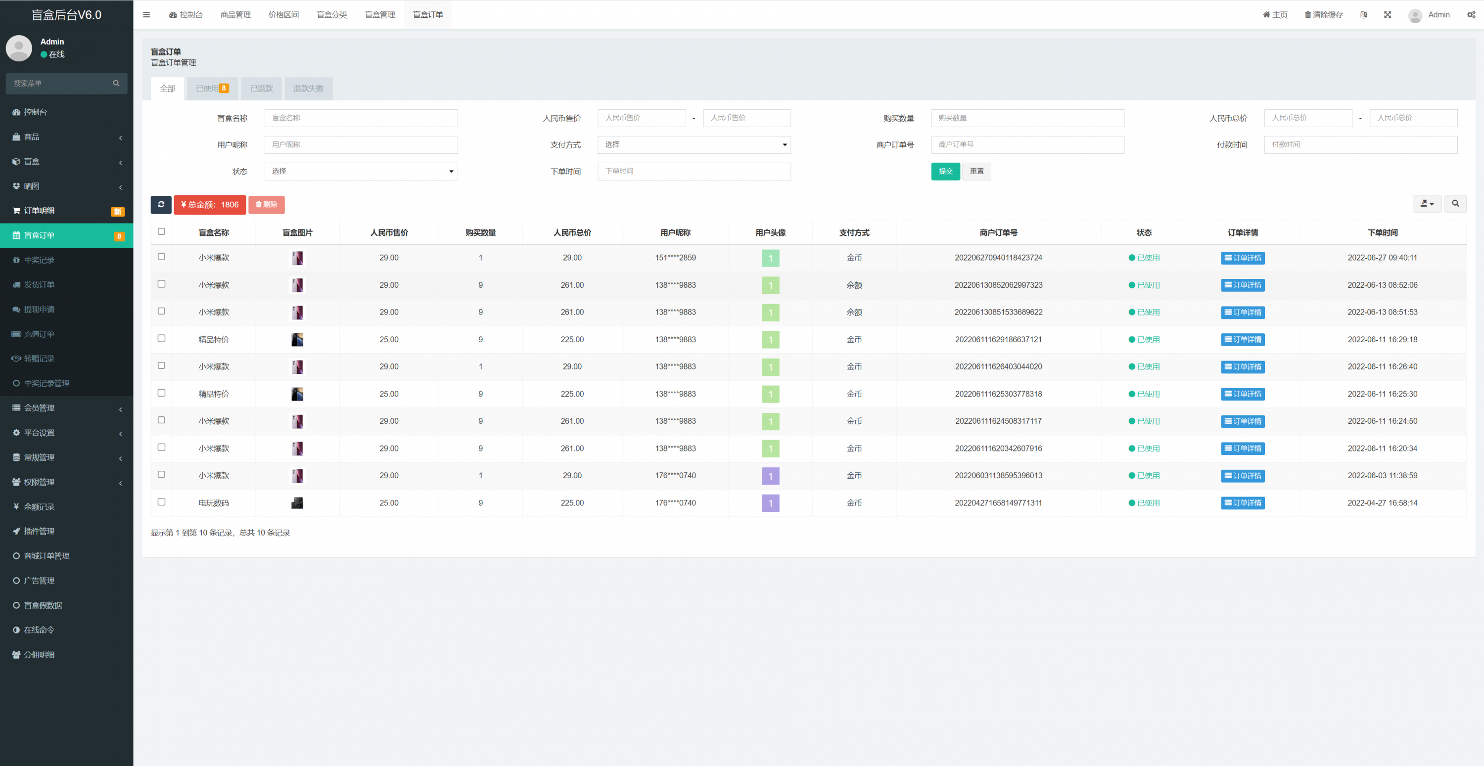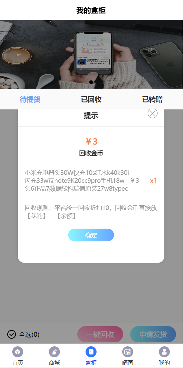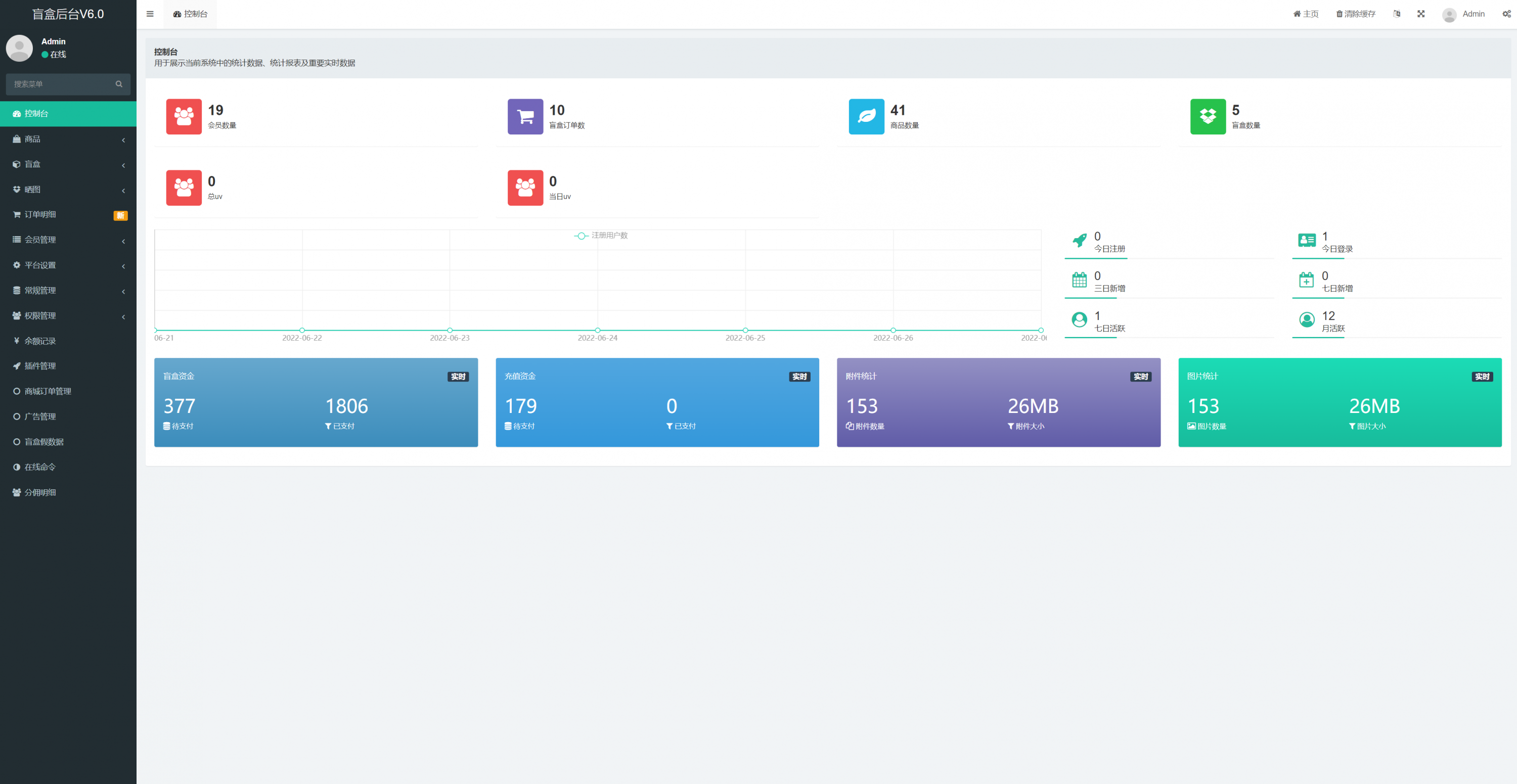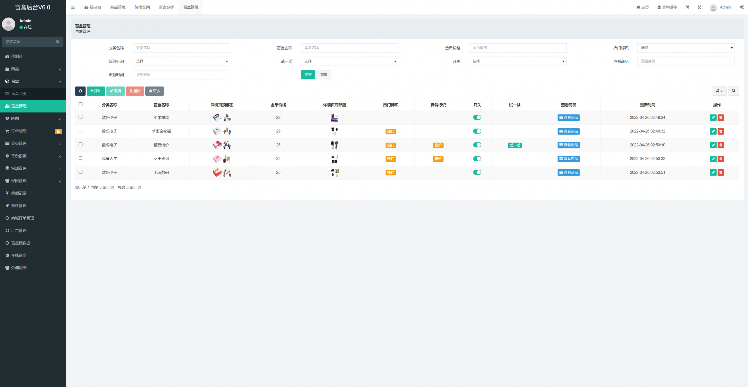admin 商城刷单 综合系统 盲盒V6.0/H5盲盒商城交易平台/盲盒抽奖系统 盲盒V6.0/H5盲盒商城交易平台/盲盒抽奖系统 盲盒商城V6.0更新 1.新增加商城功能:推荐改成商城,后台添加商品,可以用金币购买商品。 2.金币升值功能:满xx 金币数量,累计24小时增加xx 金币,按照后台百分比升值。 3.增加推广赠送金币,赠送金币数量可在后台设置 4.增加外部广告图片展示,可以后台设置跳转链接 5.余额增加提现功能,回收金额可以快速提现