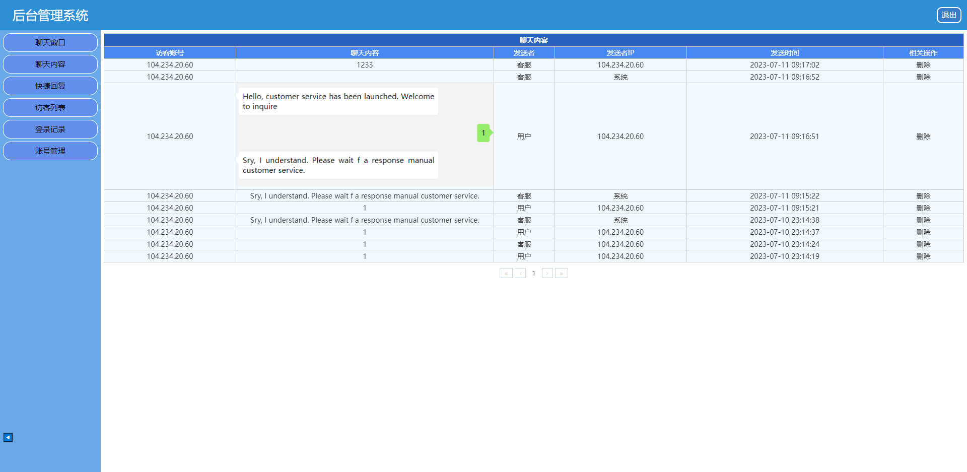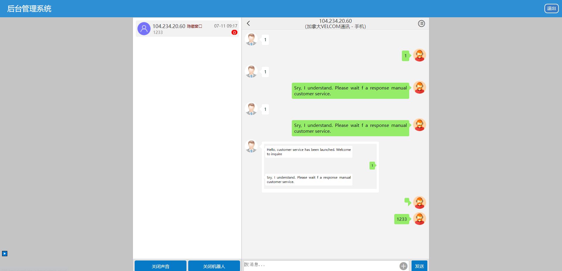 admin 社交通讯 综合系统 简洁版海外客服系统/在线客服系统/即时聊天通讯 1,此版本采用前台一人或多人与后台一人(管理员)进行会话模式 2,此版本前后台只能发送文字和图片(图片是选择后自动发送) 3,前后台根据IP来识别不同的会话者 4,前台发起会话后,后台会即时响应并有提示音(可关闭此提示音),后台可识别会话者的状态,如在线,离线,隐藏窗口 5,首次会话有公告提示,此内容直接在代码中修改 6,后台可设置是否关闭机器人,如关闭,正常会话模式,如打开,自动回复模式,自动回复内容要自己在代码中增加或修改