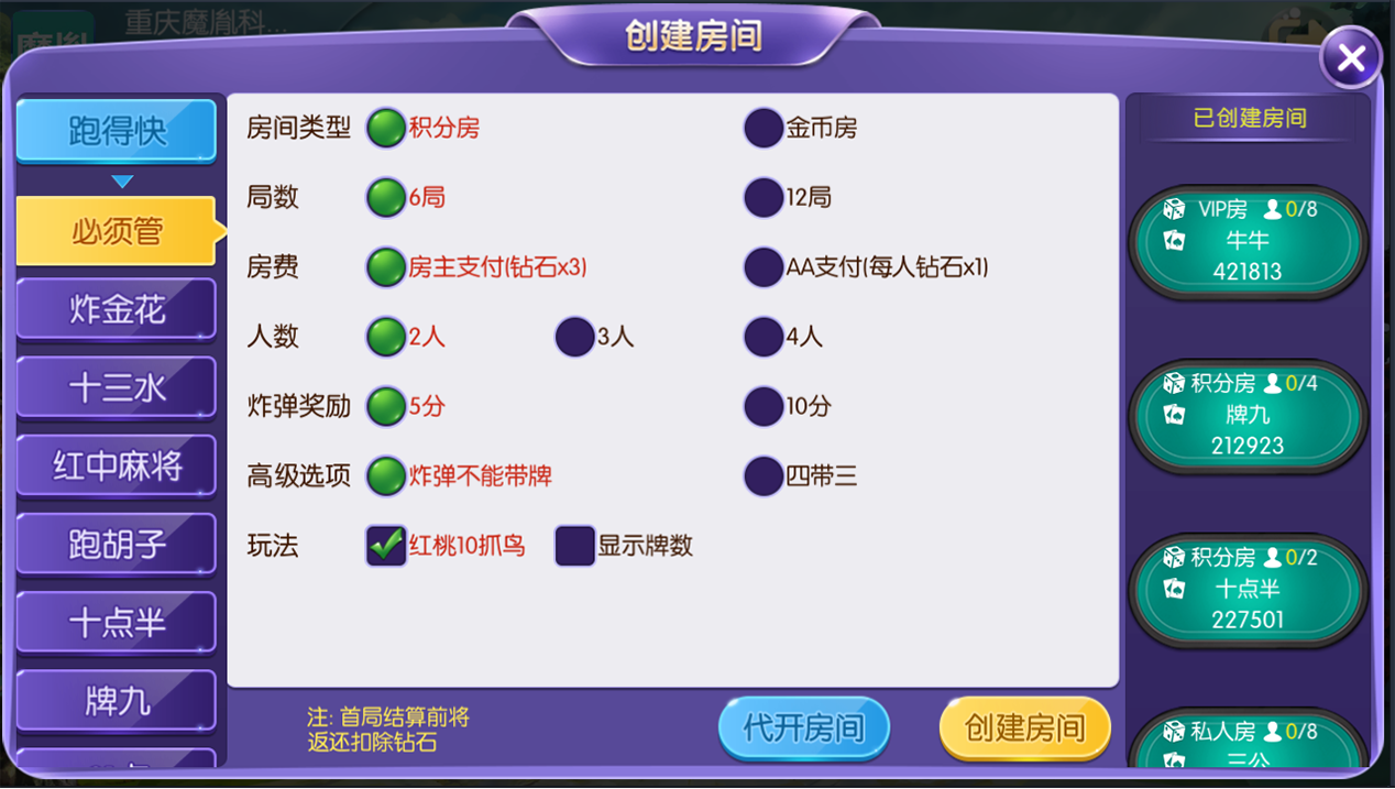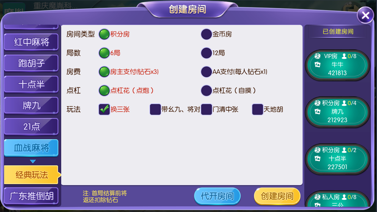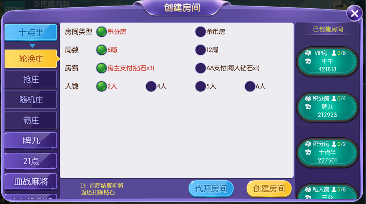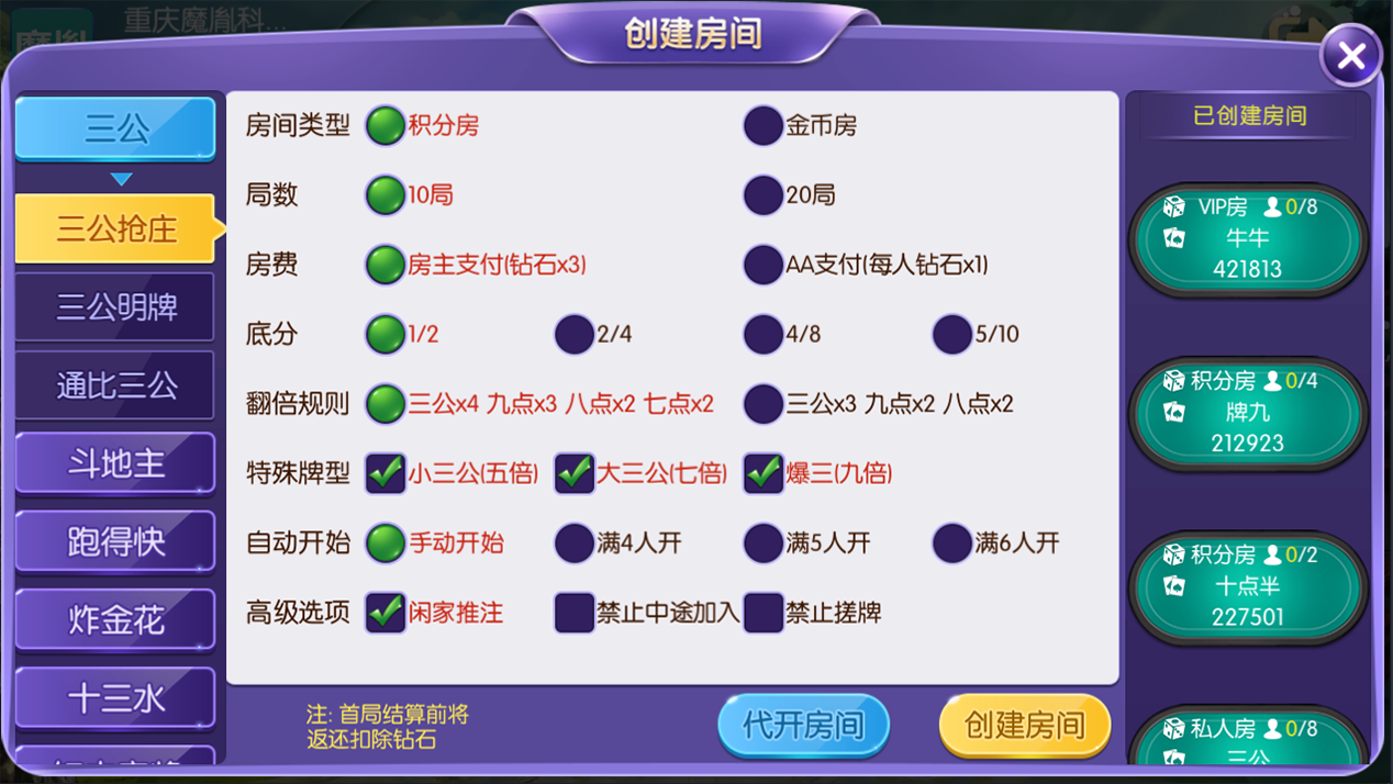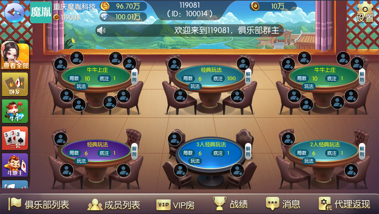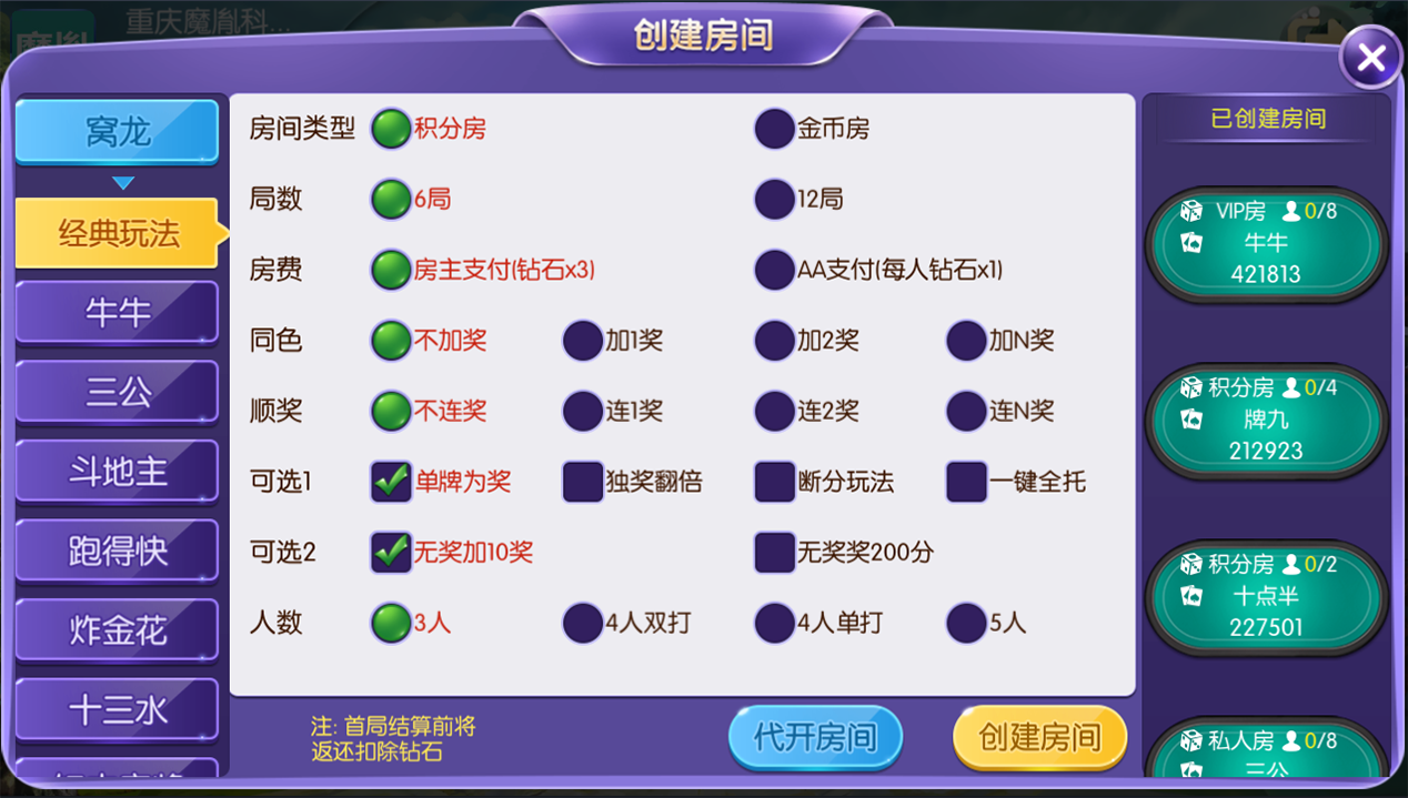 玩法支持积分房、以及金币房,带大联盟亲友圈,支持VIP房,平台还包括玩家代理返现功能,有助提升推广模式策略。