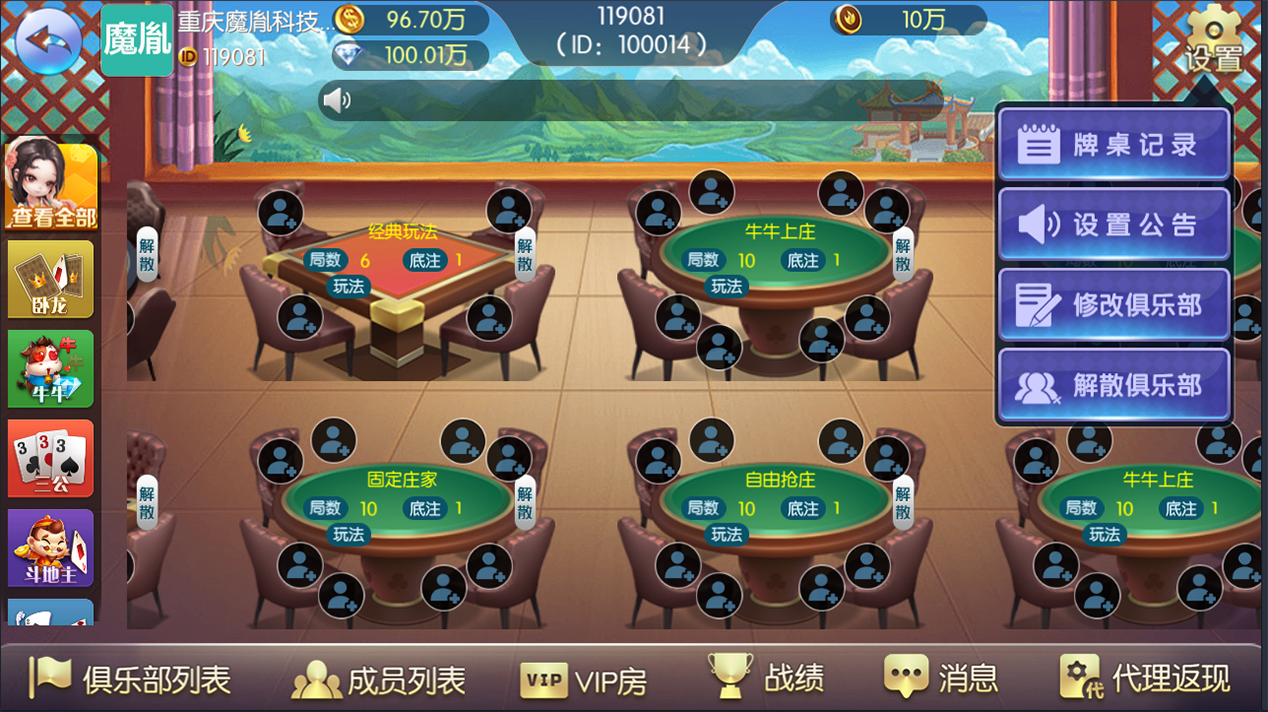 游戏分类介绍:窝龙、牛牛、三公、斗地主、跑得快、炸金花、十三水、跑胡子、十点半、牌九、二十一点、豹子王、红中麻将、血战麻将、广东推倒胡、山西推倒胡、潮汕麻将等等游戏。