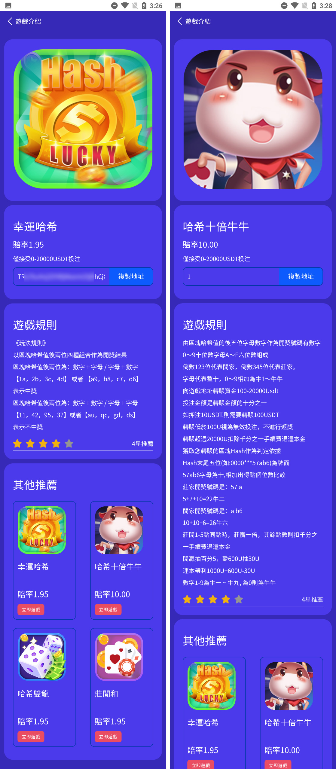 系统包含游戏:幸运哈希、哈希牛魔王、哈希双龙、庄闲合