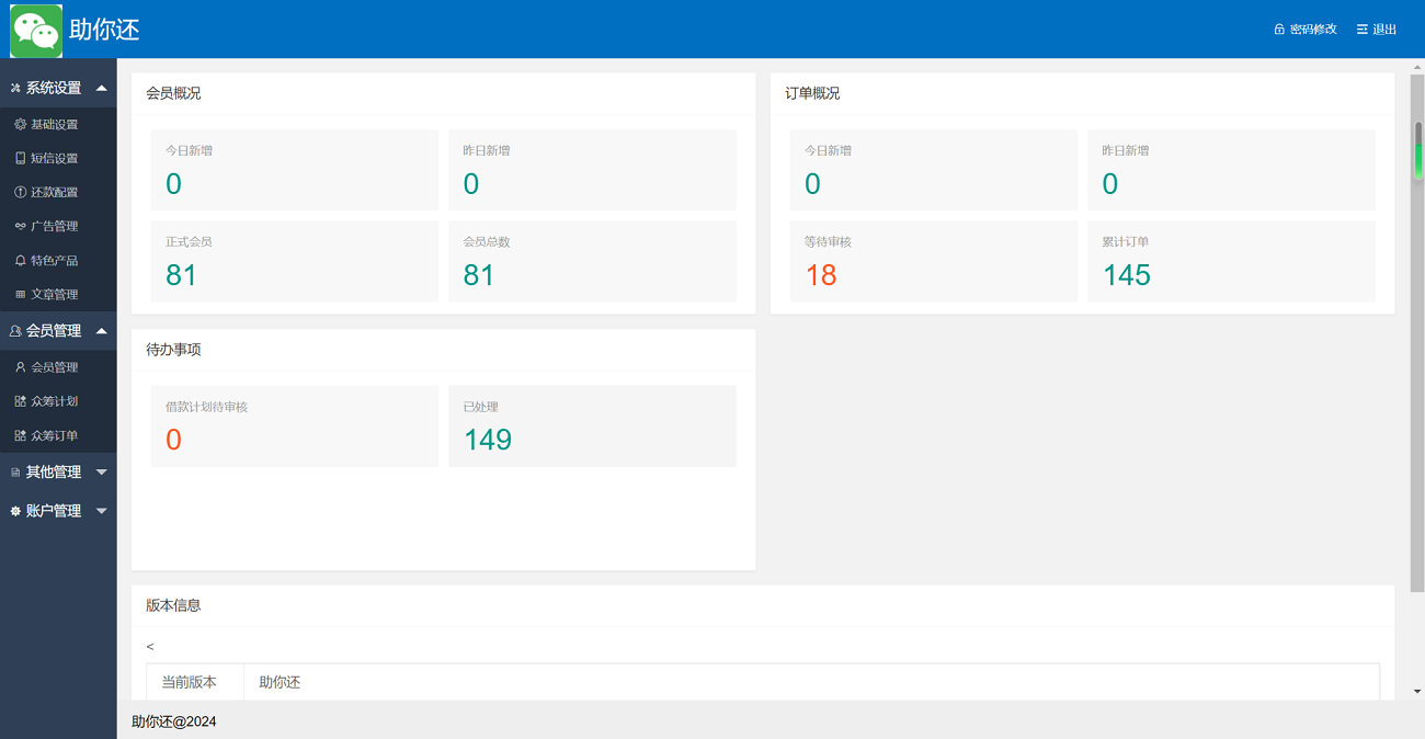 admin 综合系统 有钱还网贷还款系统,人人还众筹还钱模式还贷系统,信用卡还款系统 有钱还网贷还款系统,人人还众筹还钱模式还贷系统,信用卡还款系统 有钱还平台新注册会员,即新入的负债者要分9次分别资助先来的11名负债者每人200元,这笔资助不是一次性给到对方,而是分九个梯队执行,梯队次数和资助次数一样,计划几个梯队就帮助别的负债者几次 你刚进来时需要资助比你先来的负债者,比你后进来的负债者也要参与众筹资助你,这时候系统采用三三复制倍增的规则为你分配级别比你低的2-9梯队的负债者为你众筹,每人付给你200元