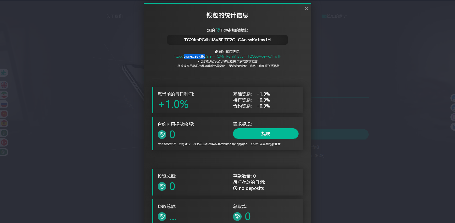 【未提现奖励】每24小时利率增加0.1%,48小时增加0.2%,以此类推(如果发生提现,则清零重新计算)