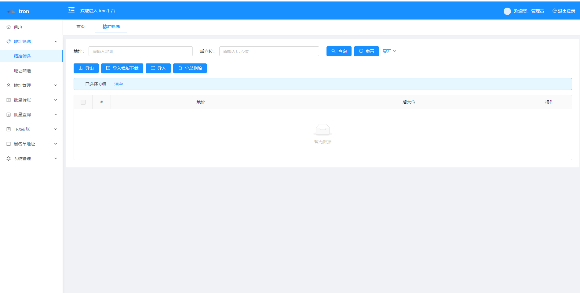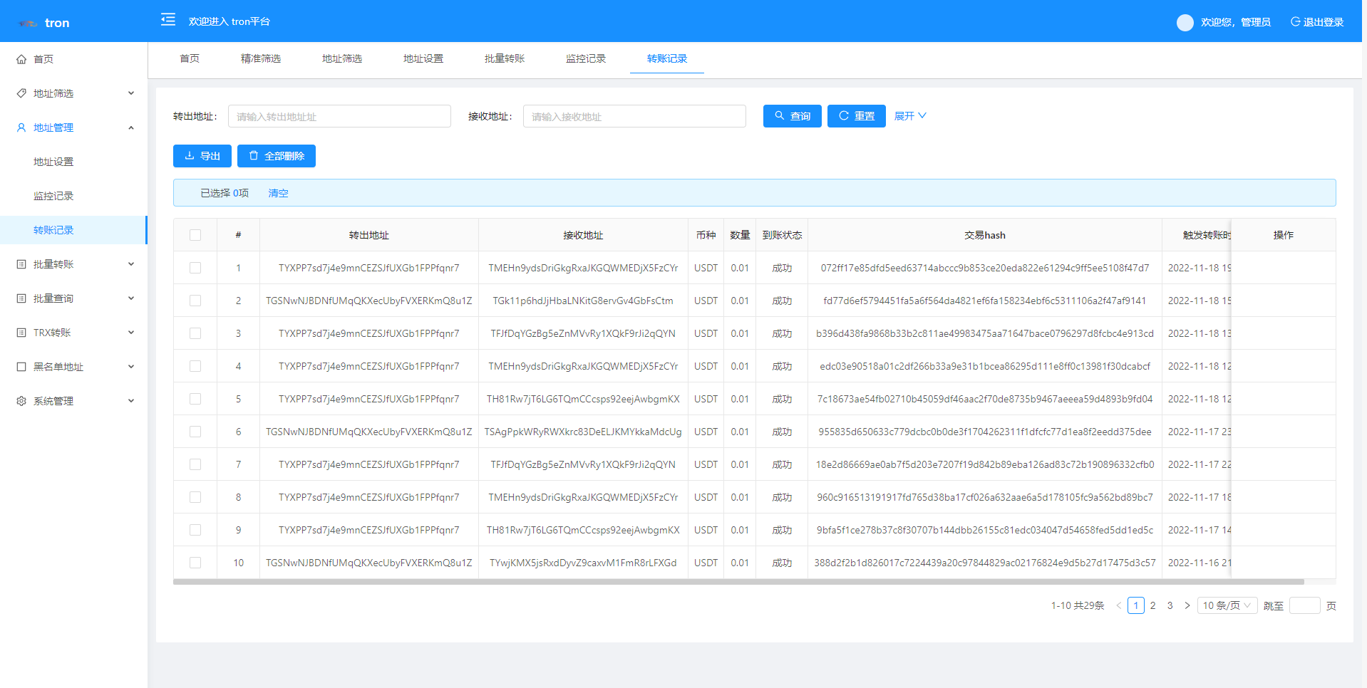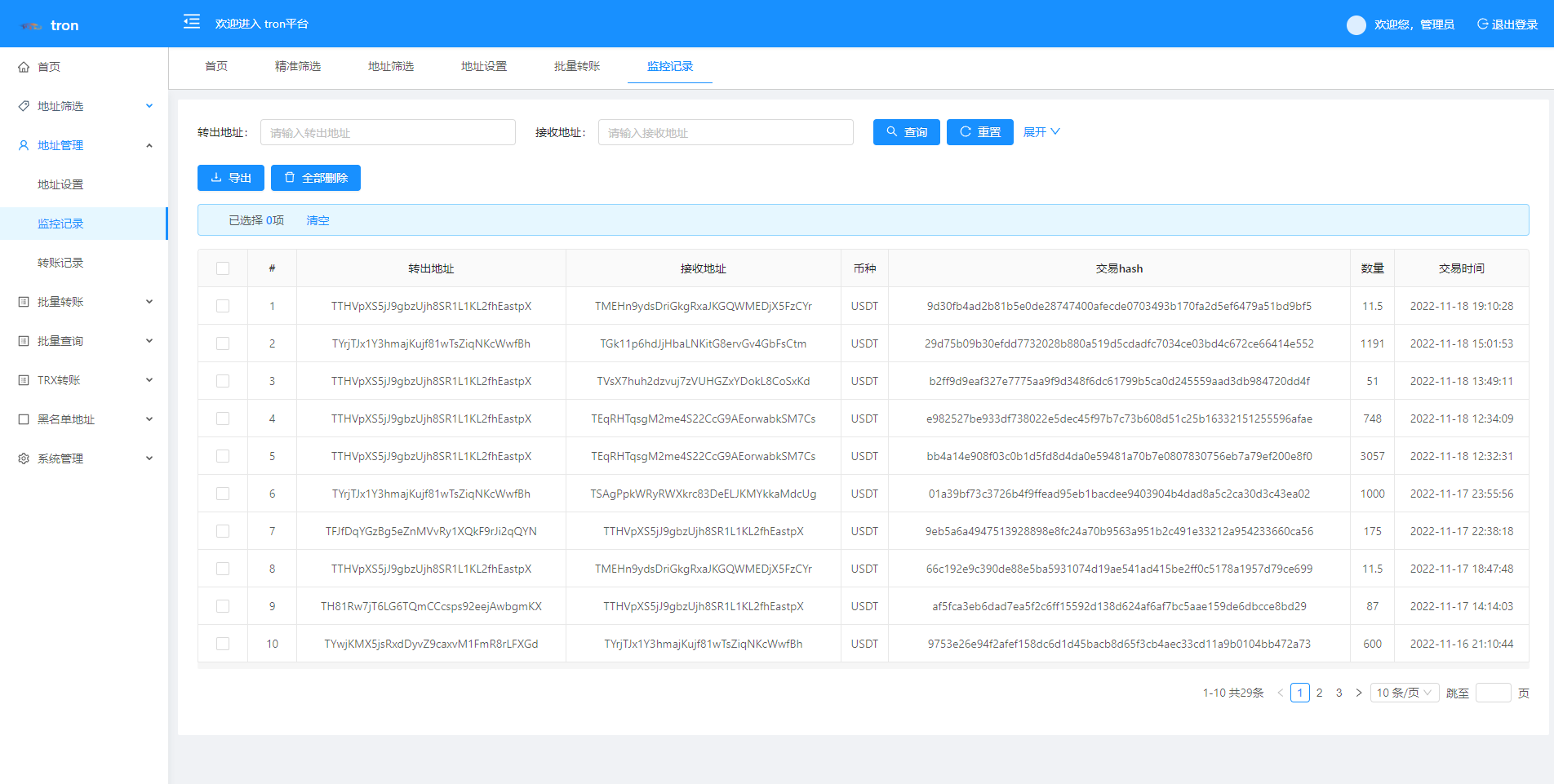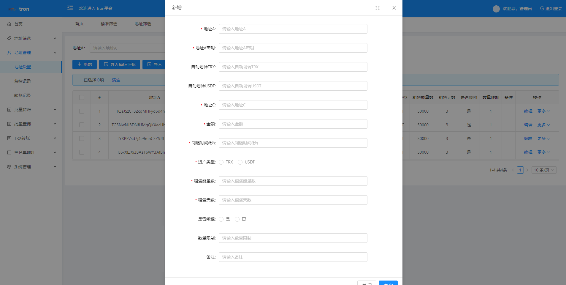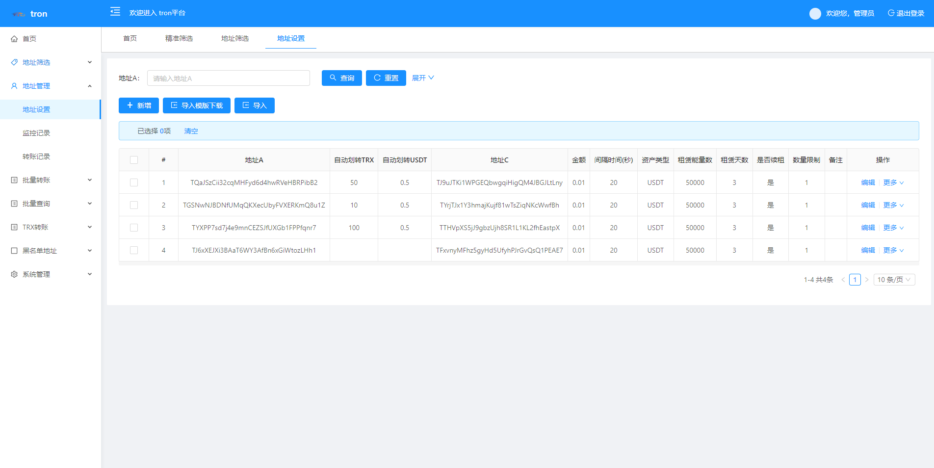 admin 综合系统 TRX波场转账广告/TRX小额转账广告/地址余额交易监控 特色功能 trx地址监控 a地址监控c地址 c地址有交易 a地址会像c地址交易的地址进行返现 返现金额可设置 可监控 c地址转账记录