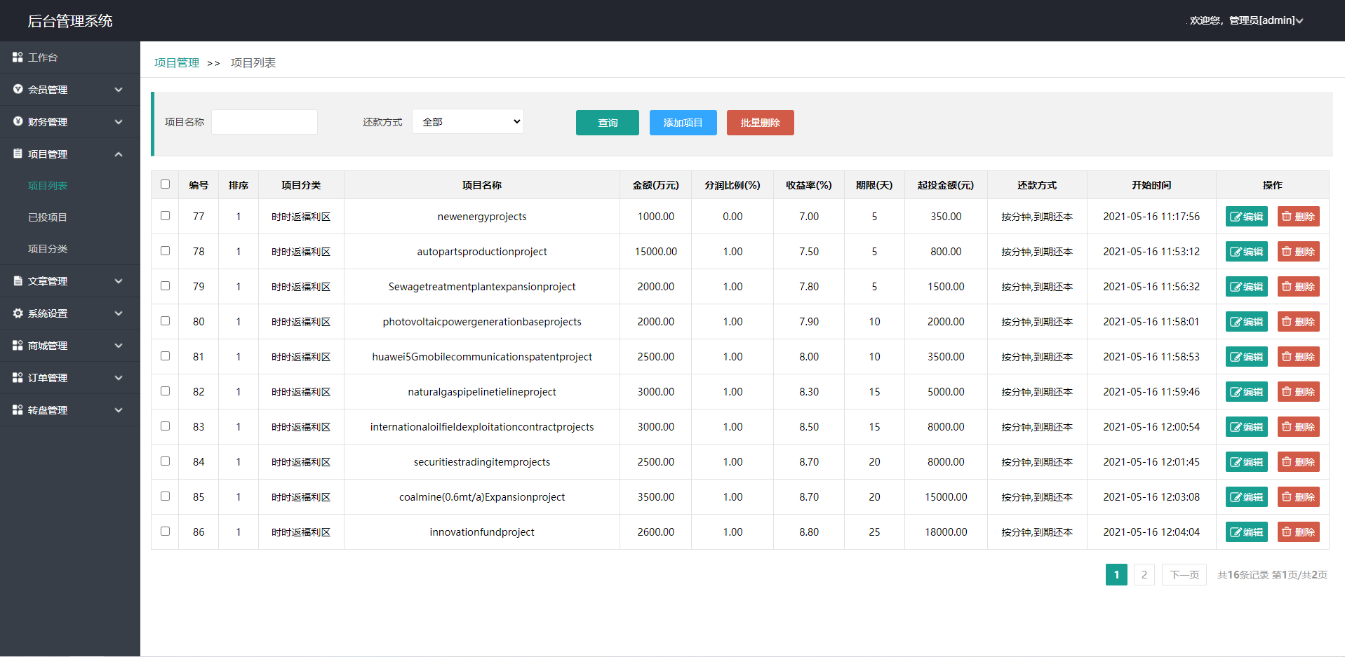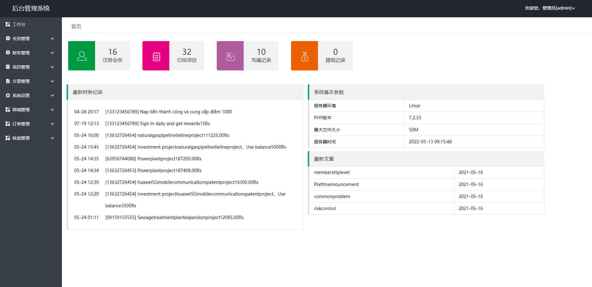 admin 微盘理财 综合系统 英文版p2p投资理财源码/众筹投资分红系统 英文版p2p投资理财/众筹投资分红系统 目前为单英文版,需要加语言可以定制 多返息方式:自然日 脚本自动结算 新增加收益分成 团队一条线明细 三级收益分成 积分商城 优惠券 幸运大转盘可以帮助运营者增加互动性 后台直接设置网站信息等,设置对于操作权限!