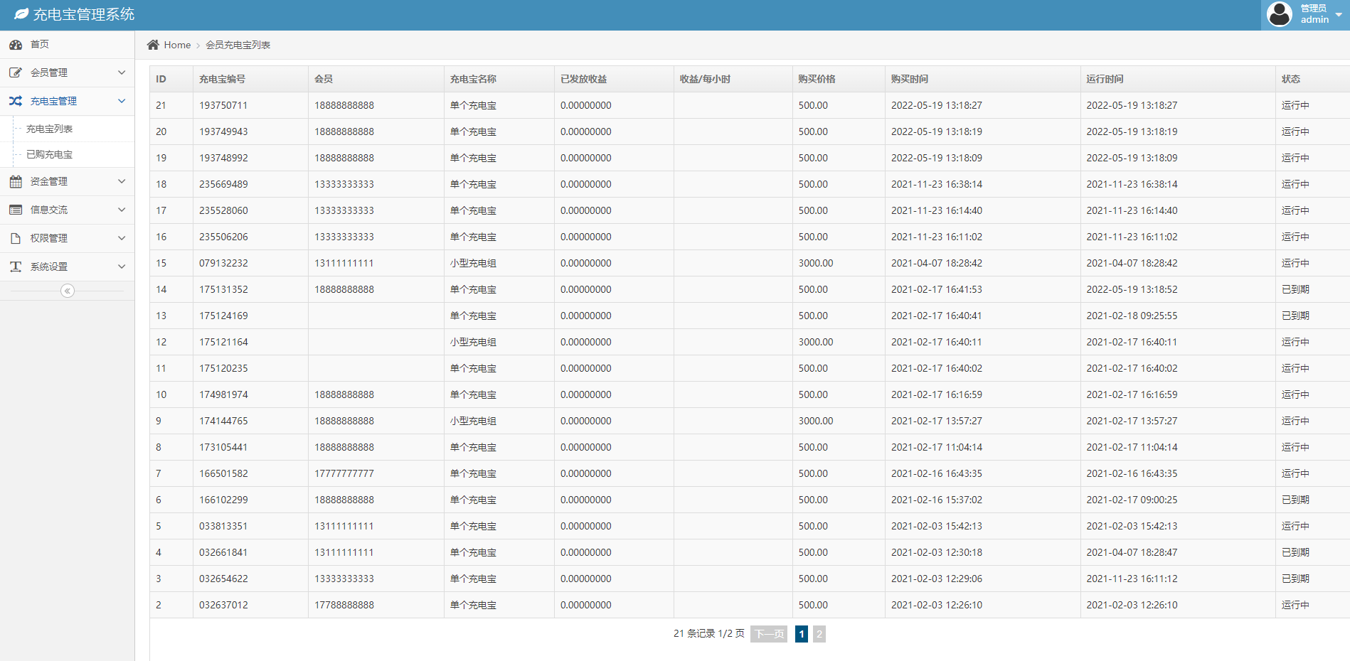 admin 微盘理财 综合系统 多语言投资系统/区块链项目投资源码/新能源投资 更改名字和图片即可变成任何你想到的项目(例如:养殖类,共享汽车类等等…) 支持后台自定义添加充电宝,支持给指定人赠送充电宝,支持后台余额充值。 多语言版本,汉语英语日语泰语韩语等等,支持前端一键切换。 支付是国内支付宝微信,支持二开usdt等支付 这版的UI非常不错,推广上下级绑定也正常,可打包APP,顺应新能源潮流充电桩也很有新意。
