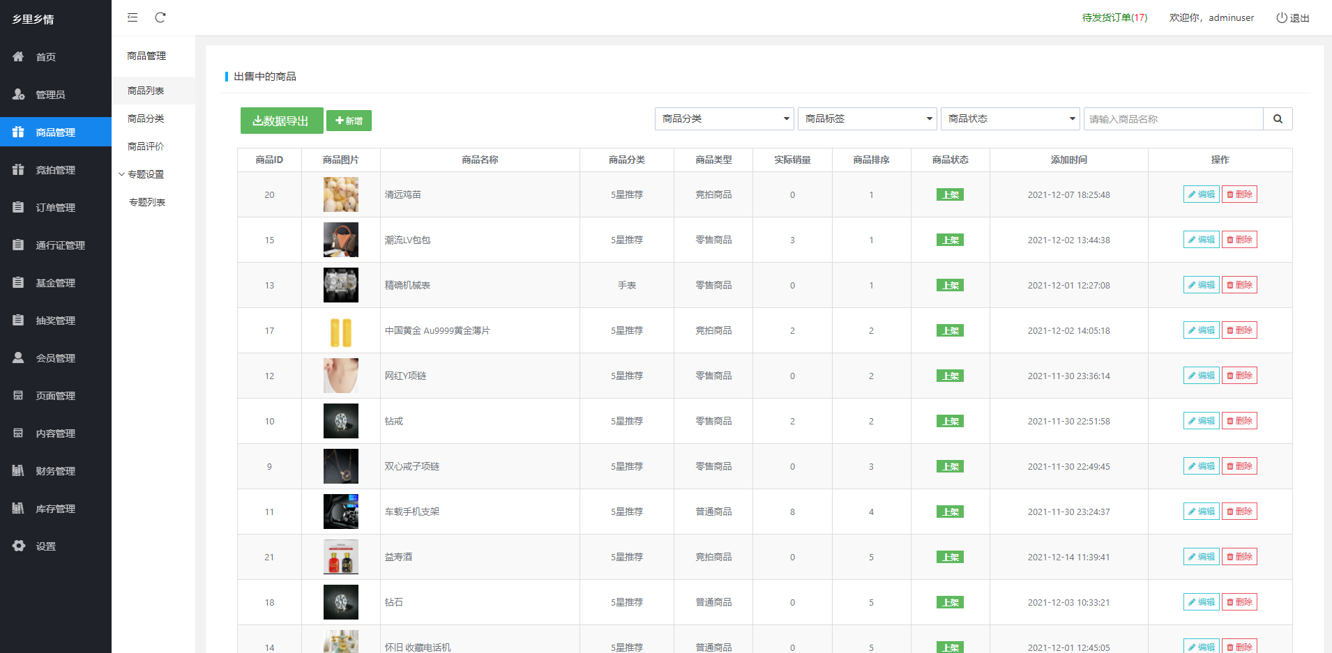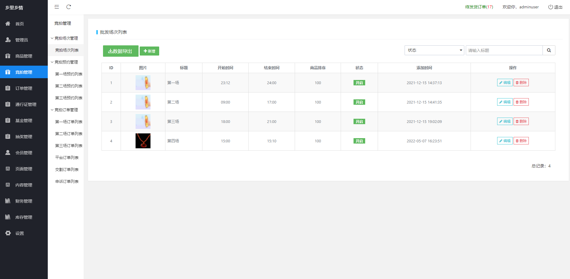 竞拍管理:添加订单 订单管理 流拍订单 预约记录 出局列表 订单抢购 匹配列表 投诉订单列表