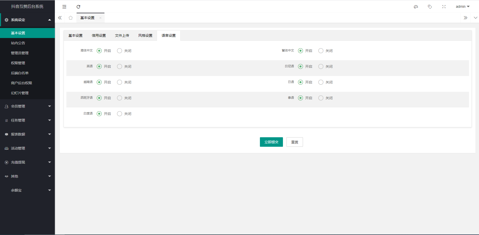 admin 微盘理财 综合系统 国际版多语言点赞抖音分享点赞任务平台源码(九种语言)/附带VUE 九种语言 :西班牙语,泰语、日语,印度尼西亚语言、越南语言、英文、繁体中文,简体中文,印度语 前台支持更换5种颜色风格,黑,银,橙,紫,绿。非常大气和美观的一套系统 前台:首页可领取脸书tiktok等点赞关注任务!任务等级分为七种,每种等级领取的任务数量各不同。三级分销,没级代理各不同。可查看个人信誉度。 后台:可自定义设置自己的网站域名,客服qq,app名字等等、余额宝理财,财务明细等等!