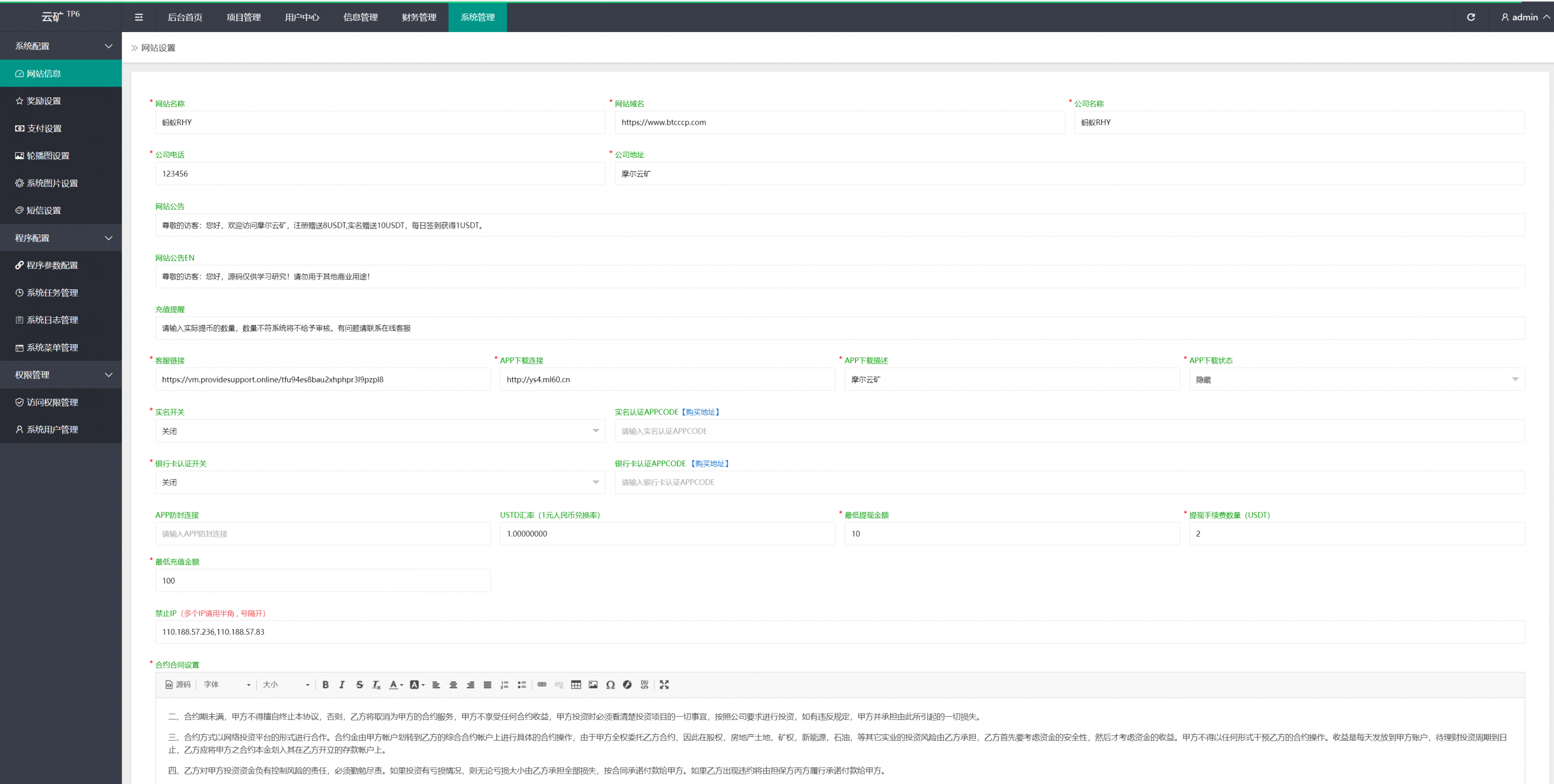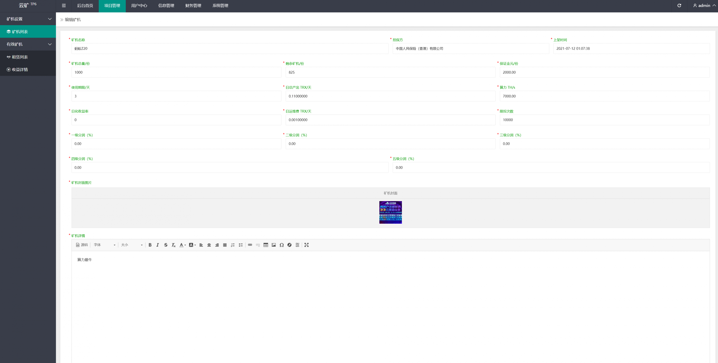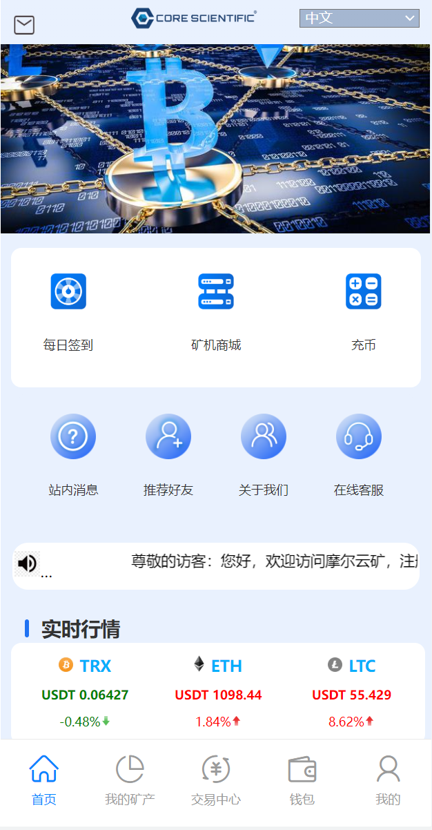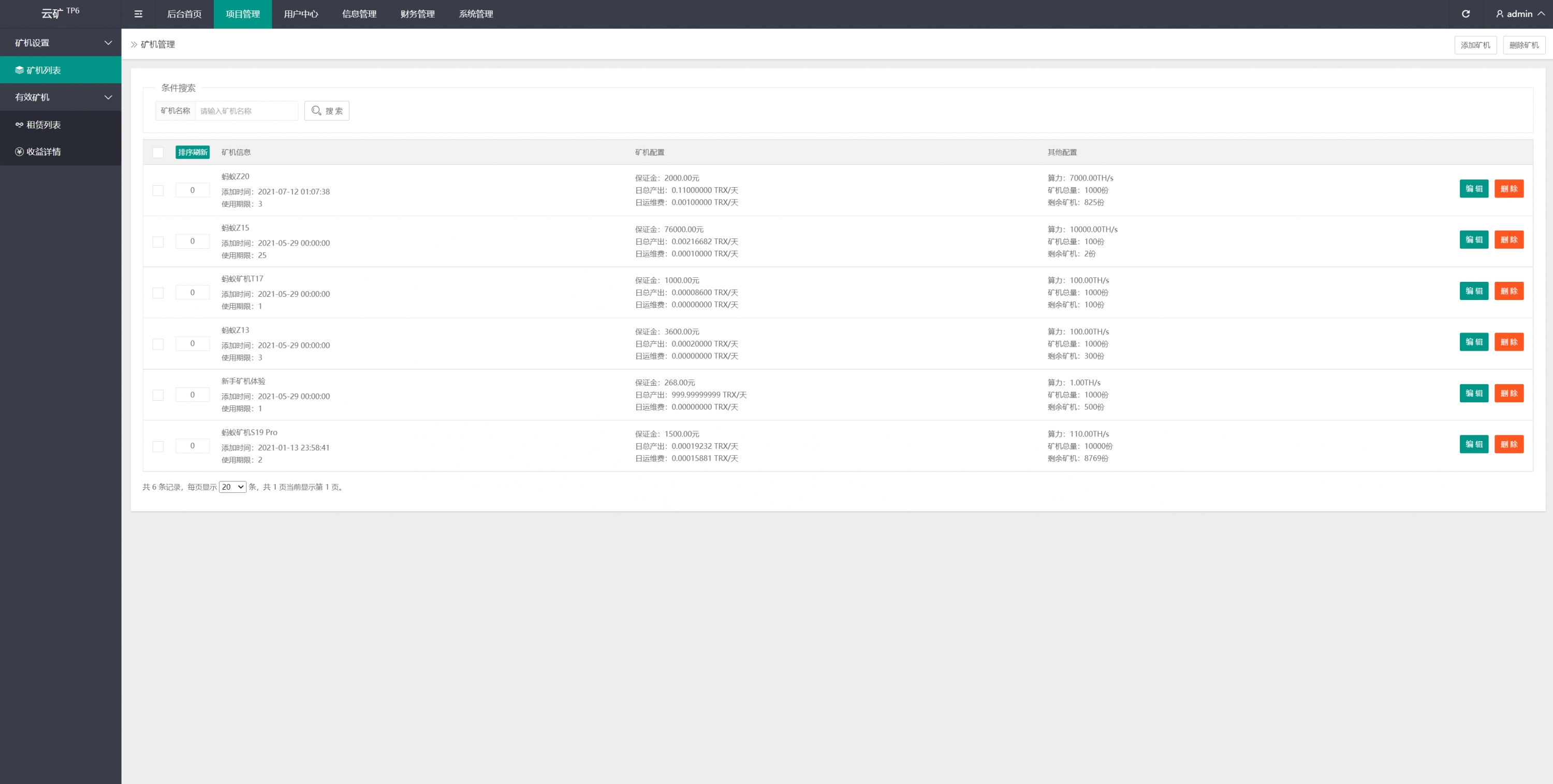 admin 微盘理财 综合系统 二开版TRX矿机系统/TRX投资系统/算力合约矿机/区块链云矿机系统 二开版TRX矿机系统/TRX投资系统/算力合约矿机/区块链云矿机系统 此套是在原版上的usdt二开的TRX玩法,前端为三种语言 充币依然使用usdt充值,使用usdt购买矿机获取TRX收益 TRX收益支持在系统自带的交易中心出售,也可以申请提币