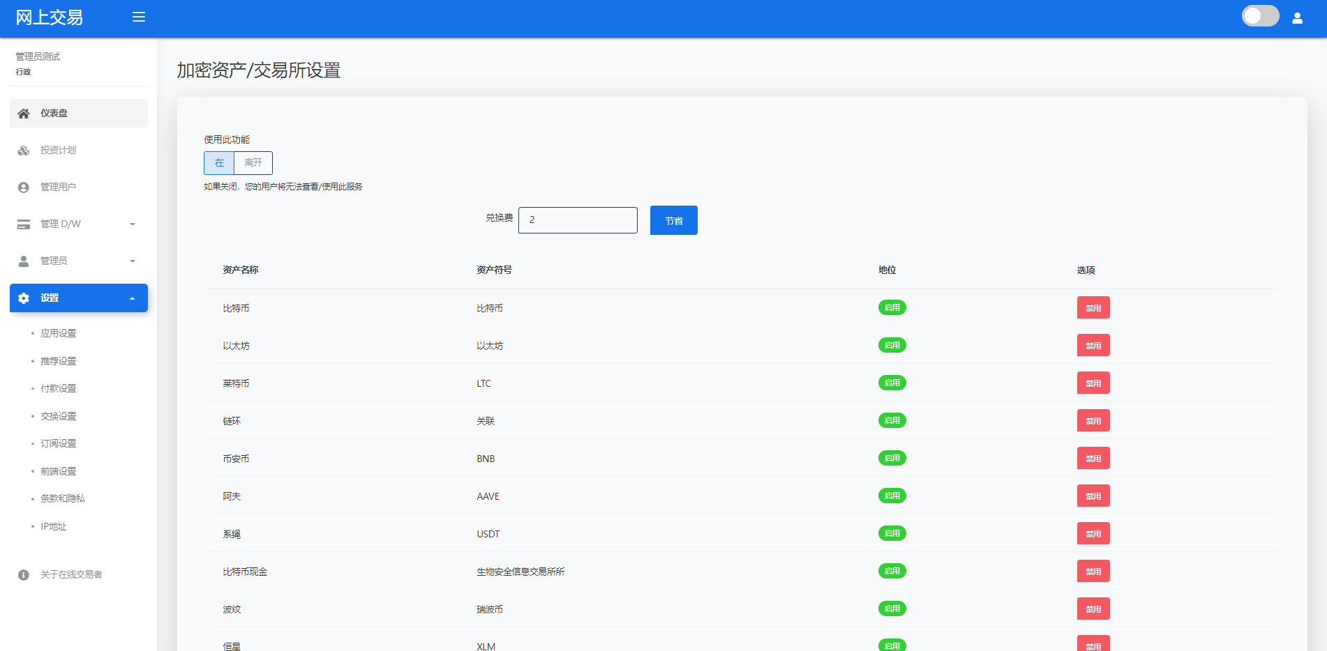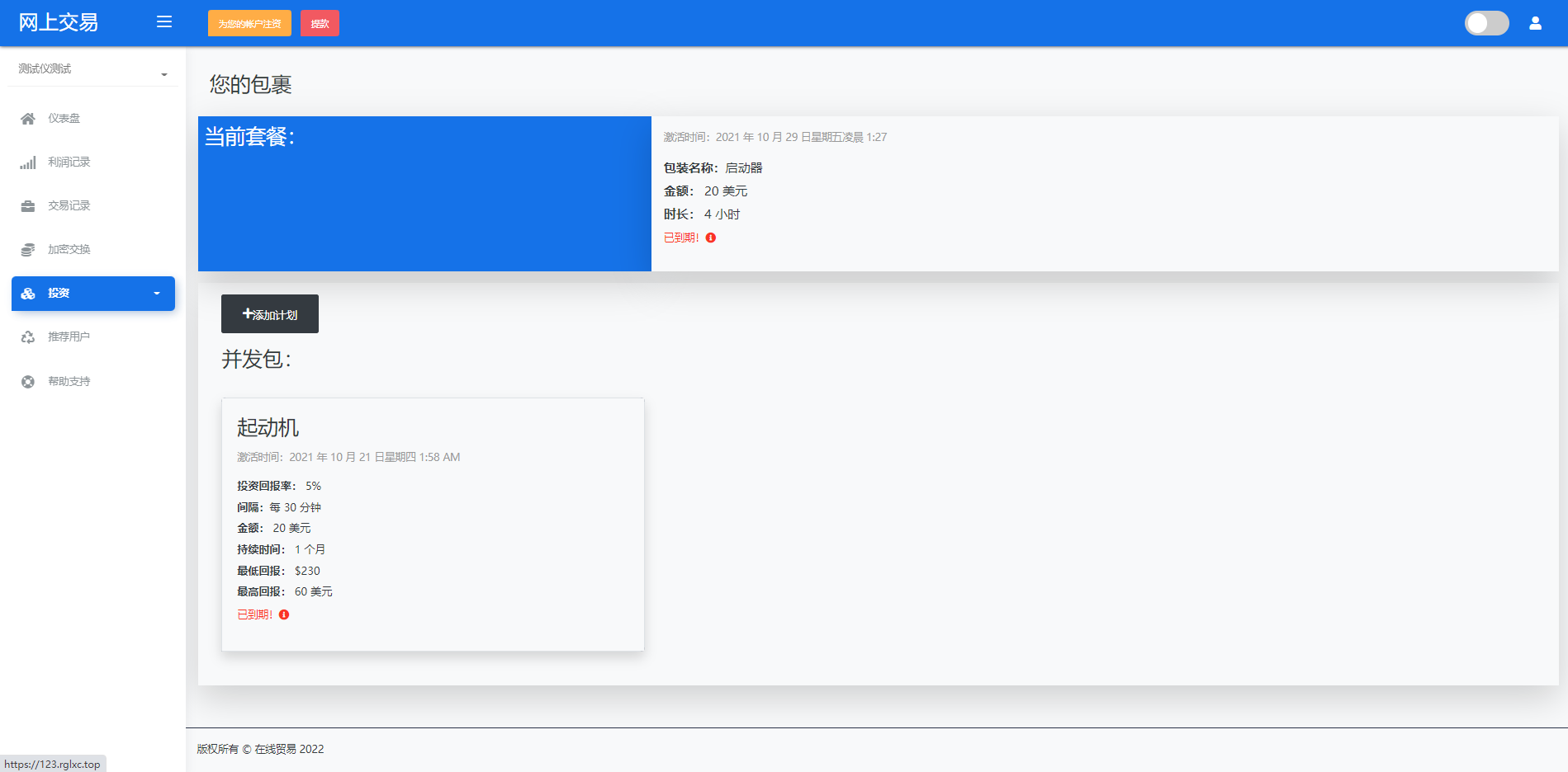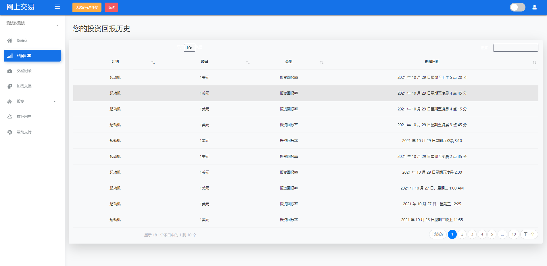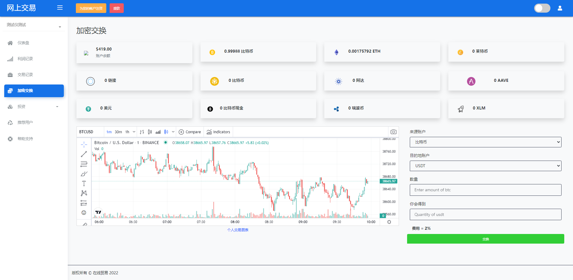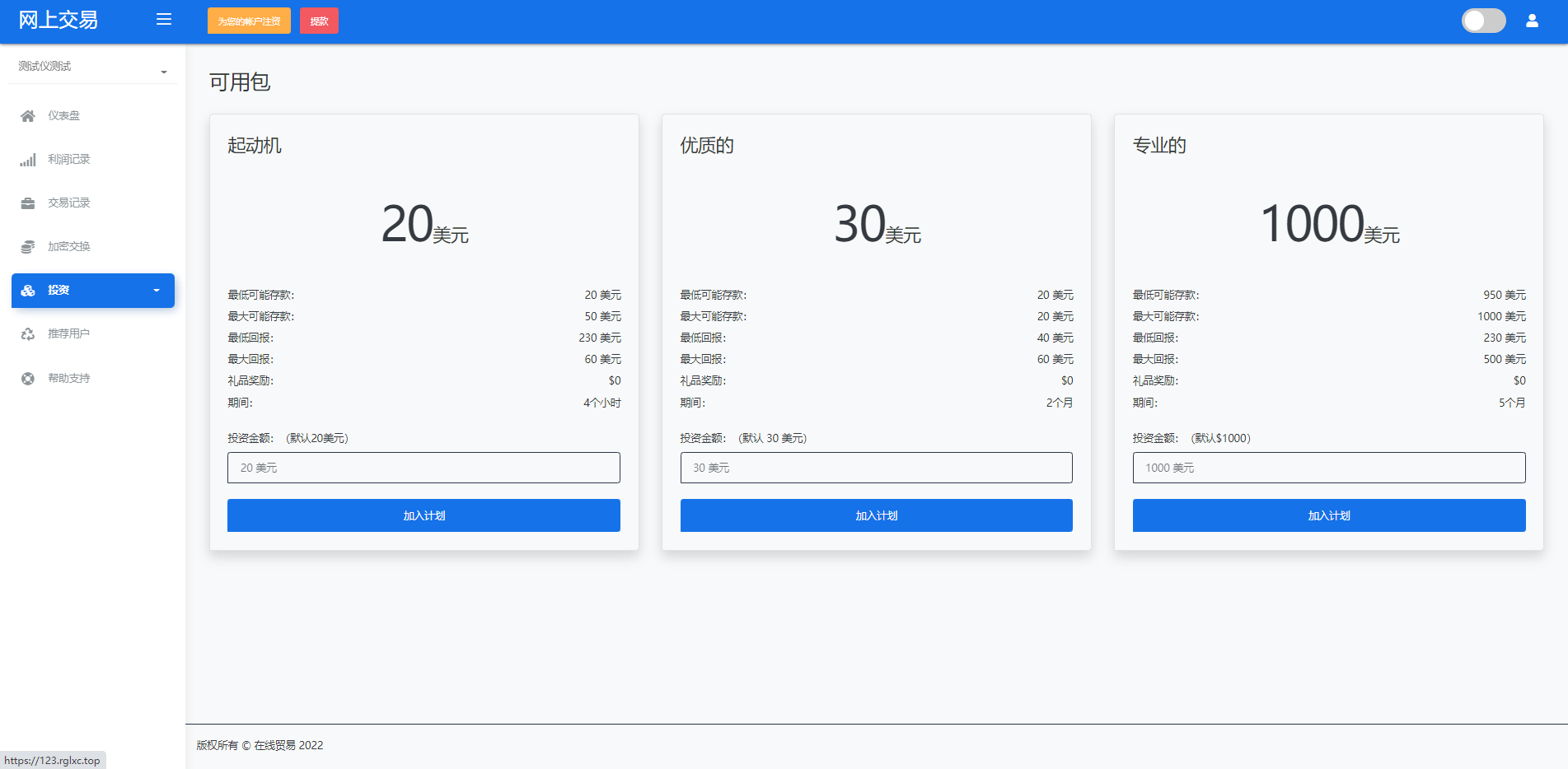 admin 微盘理财 综合系统 海外版区块链交易/理财投资/虚拟币场外交易系统/源码自适应 系统支持虚拟币交易实时交易附带行情实时跳动 支持虚拟币理财,自定义添加投资计划 支持虚拟币交易场外互换交换功能 支持USDT虚拟币充值提币、还有Paypal等其他通道 系统为纯英文版,截图是浏览器自动翻译 简单而言本系统就是简化理财投资和加密货币的投资系统和虚拟币行情实时监控的一个交易系统