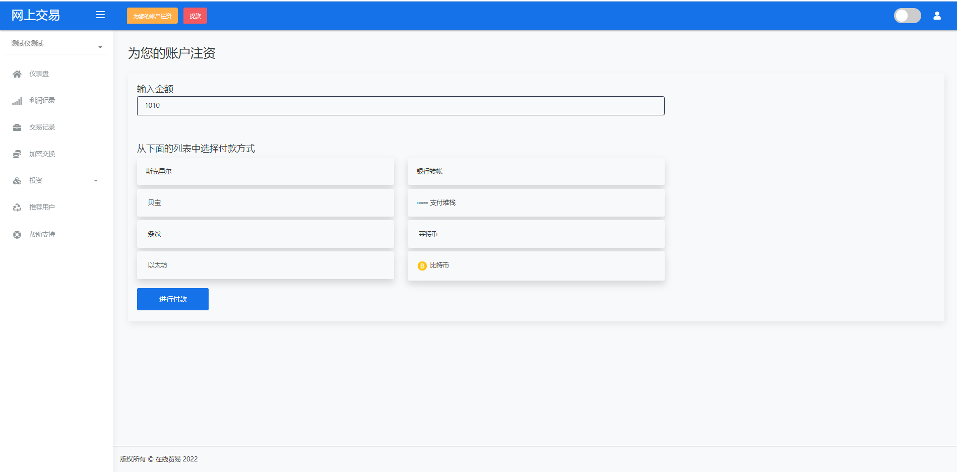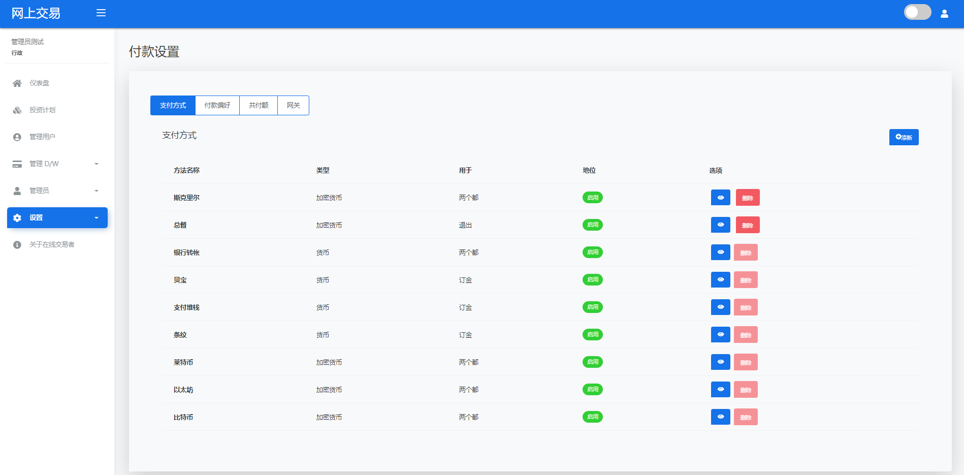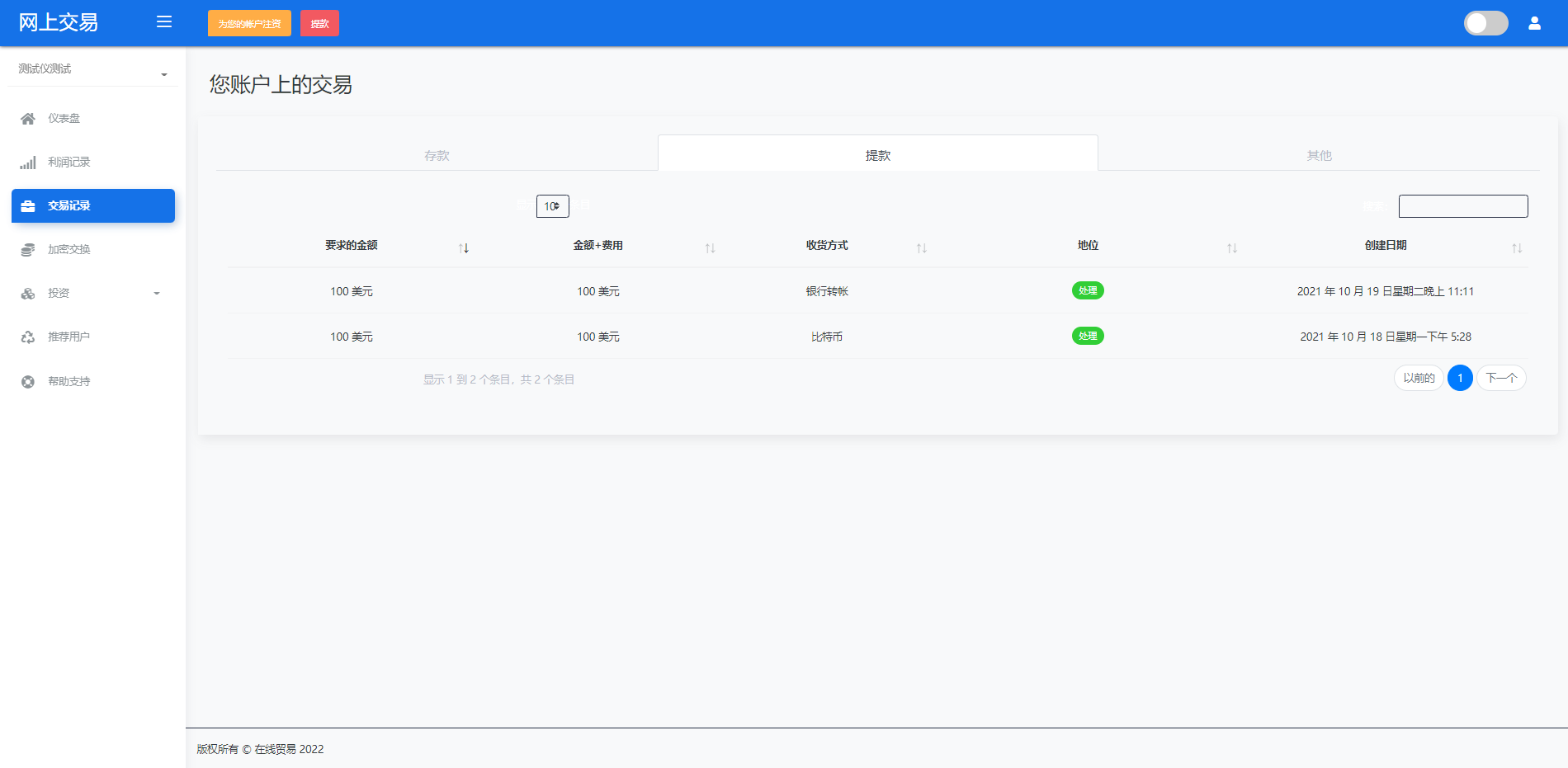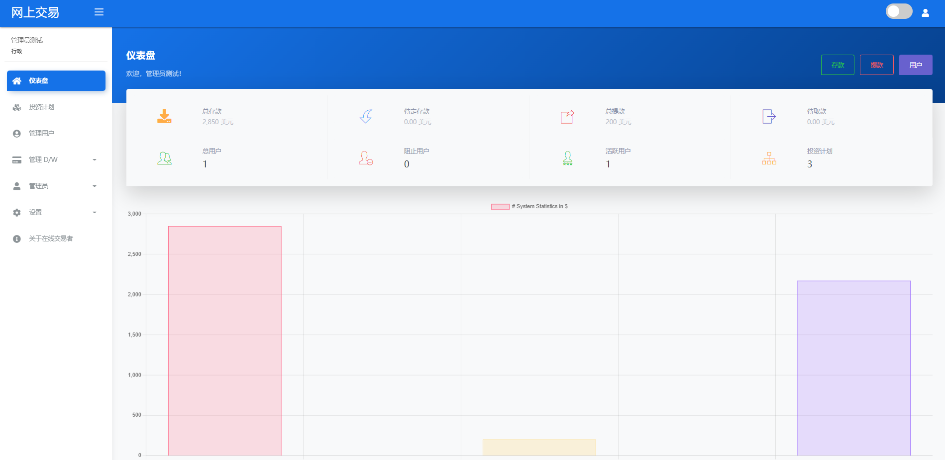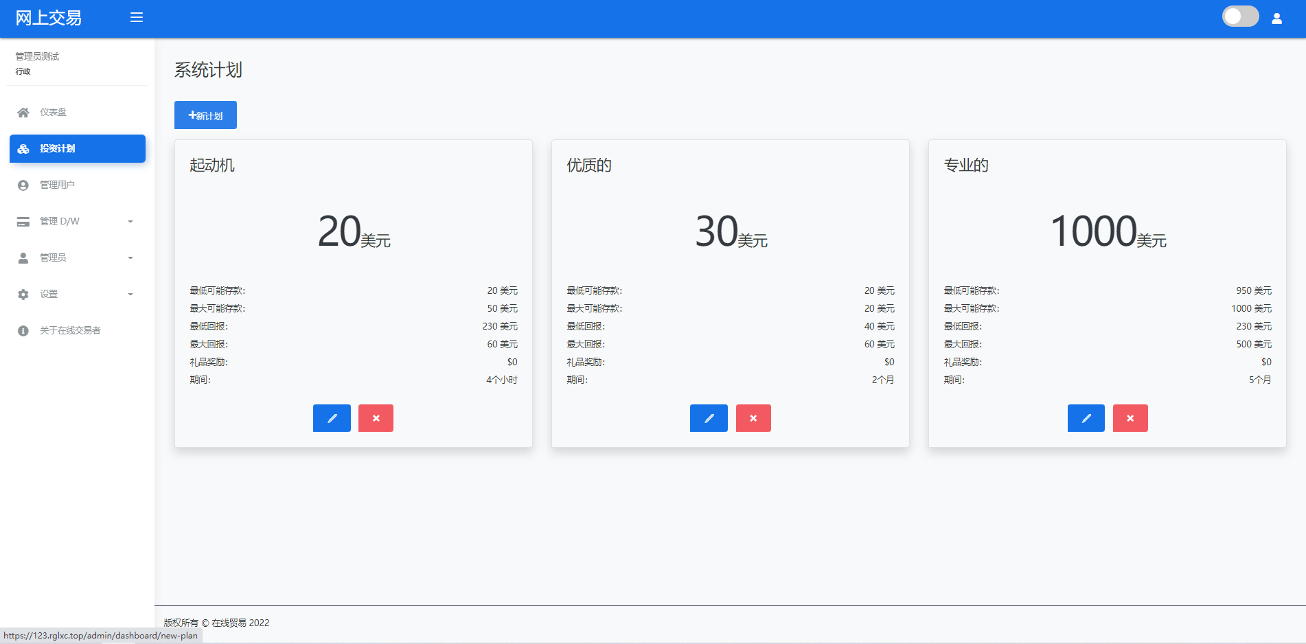 admin 微盘理财 综合系统 海外版区块链交易/理财投资/虚拟币场外交易系统/源码自适应 系统支持虚拟币交易实时交易附带行情实时跳动 支持虚拟币理财,自定义添加投资计划 支持虚拟币交易场外互换交换功能 支持USDT虚拟币充值提币、还有Paypal等其他通道 系统为纯英文版,截图是浏览器自动翻译 简单而言本系统就是简化理财投资和加密货币的投资系统和虚拟币行情实时监控的一个交易系统