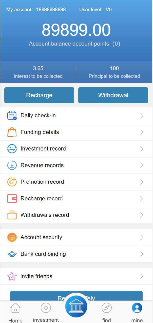 admin 微盘理财 综合系统 二开多语言版投资理财系统/项目投资源码/到期还本/usdt充值 二开多语言版投资理财系统/项目投资系统/到期还本/usdt充值 此套系统新增了多种语言,更改为usdt充值,另外优化一下细节