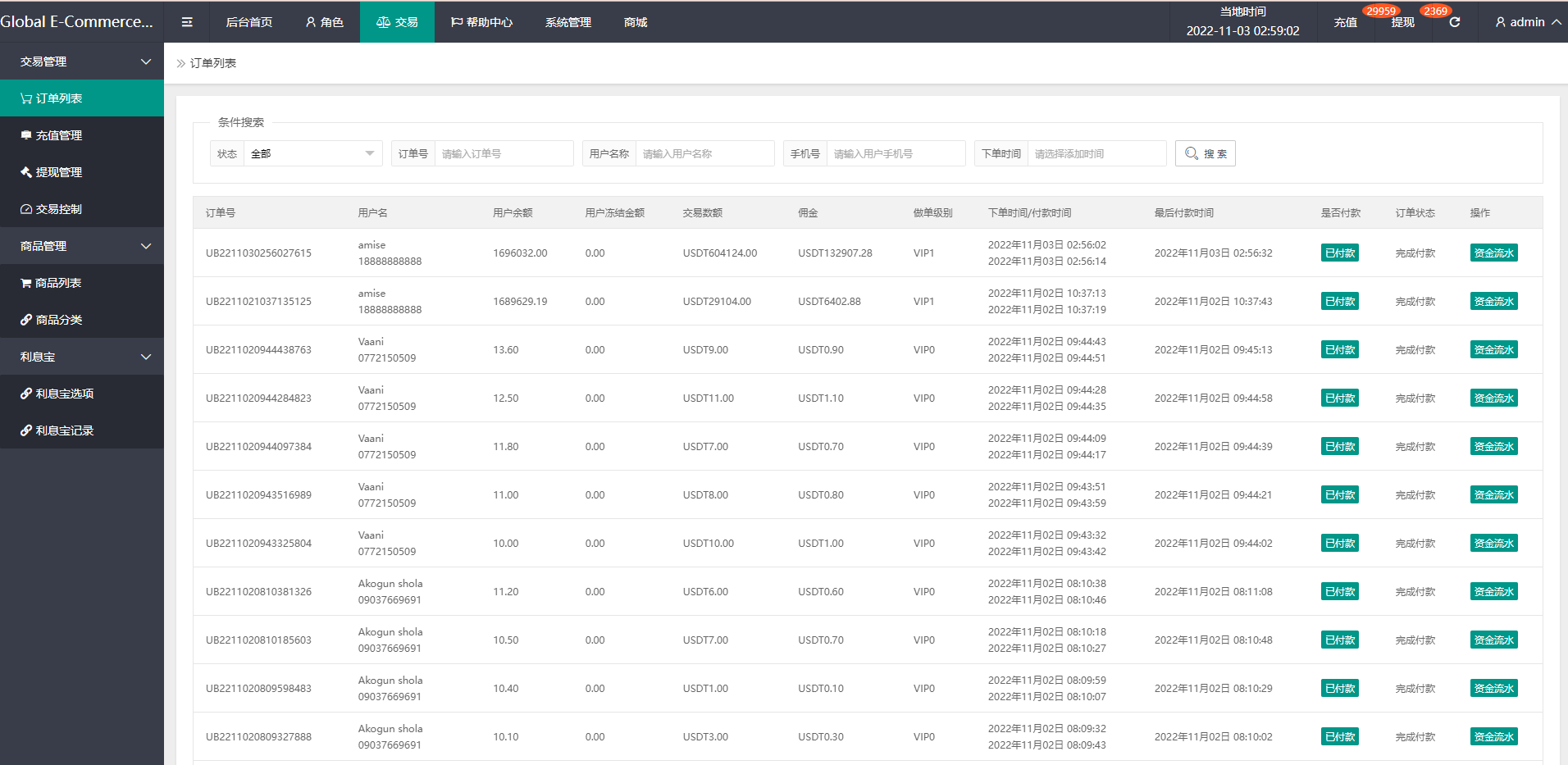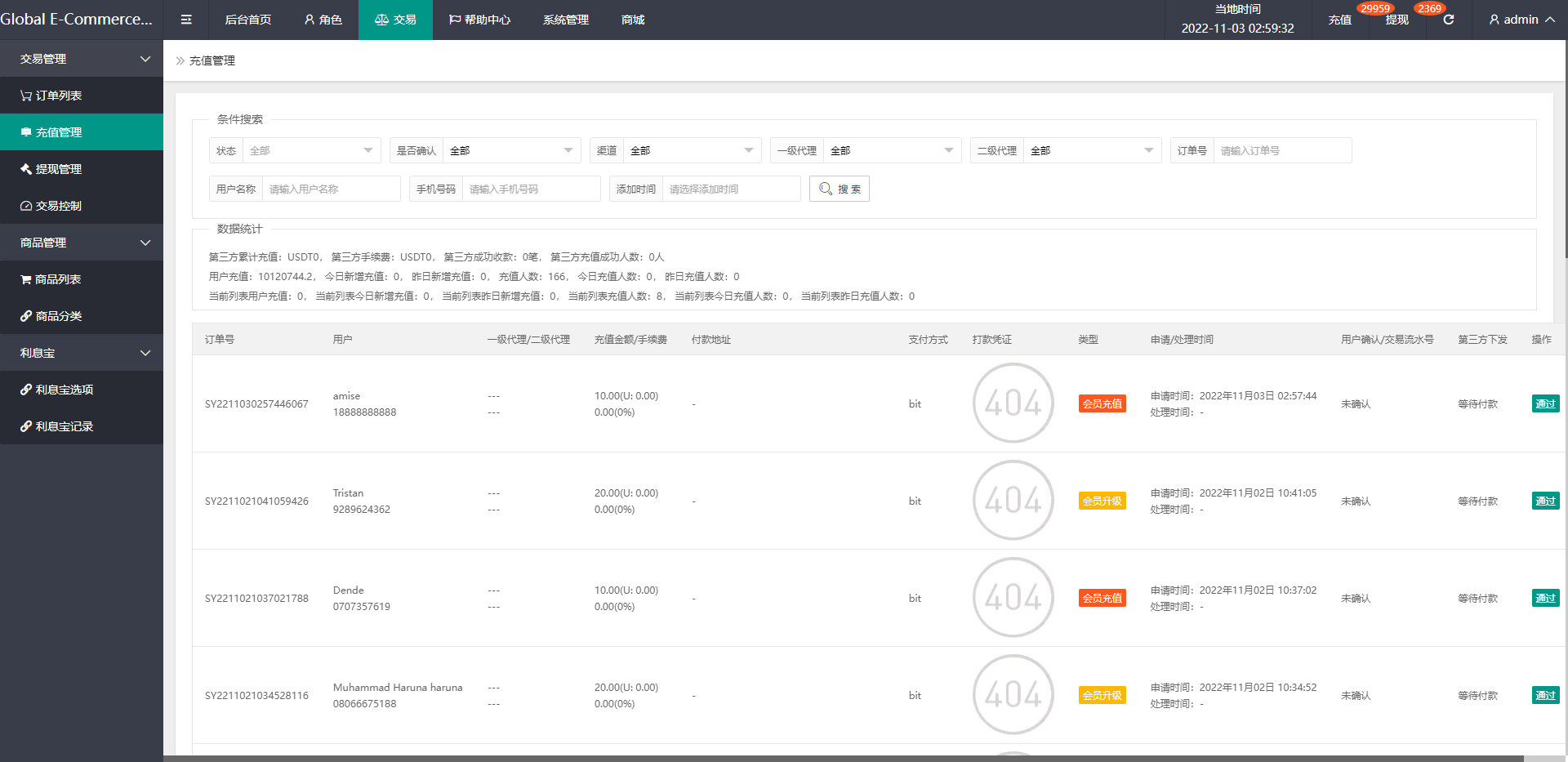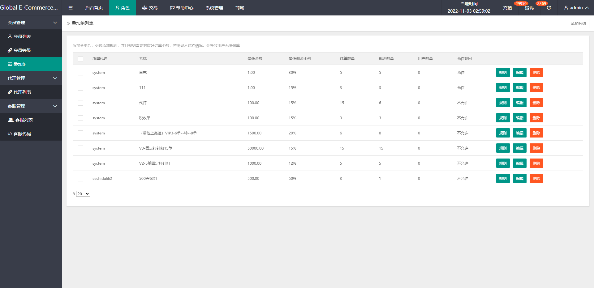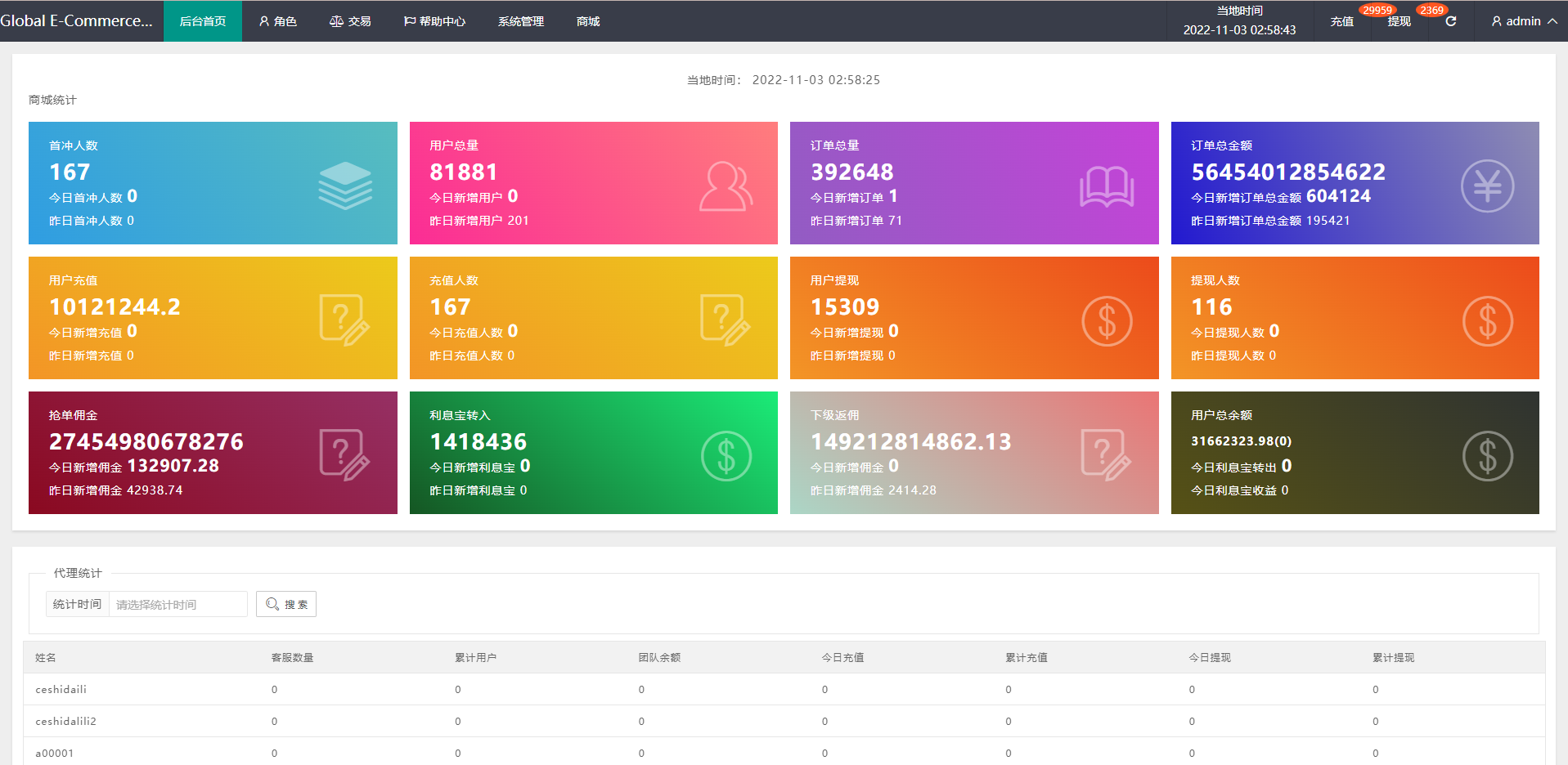 admin 商城刷单 综合系统 新UI多语言抢单刷单系统/海外刷单/订单自动匹配系统 全新定制UI,前端多语言后台可控制,可设置默认语言和默认时区 IP注册限制、系统时区配置、站内消息公告群发等组多功能 1.会员自动匹配订单,获得佣金收入。 2.代理后台+优化系统内核+打开速度更快,运行更顺畅 3.好友扫描你的二维码注册完成即可成为你的下级、会员3级代理模式分享下级获得下级返佣收入 4.邀请会员注册奖励机制,邀请会员充值奖励机制,全部自动发放 5.三级分销,带客服,等级优先,充值提现优先完美后台查询功能