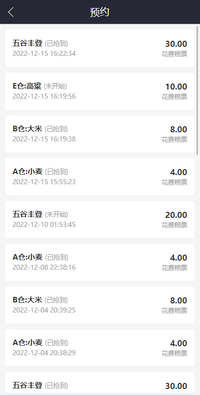 每天抢购交易时间分5个时段,在每个规定时间段内,抢到则能下单,抢不到只能等下一轮,抢不到退回预约粮票。