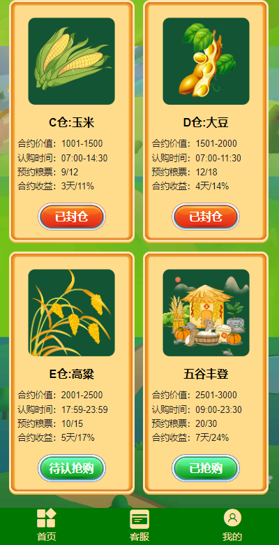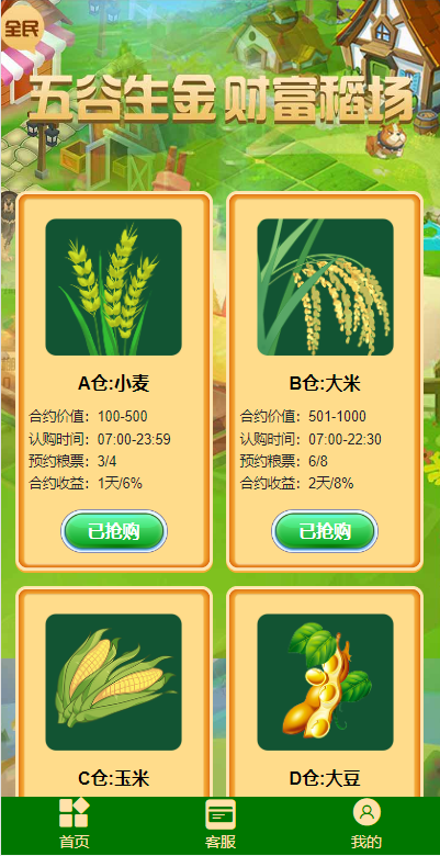 合约价值:100~500RMB,开仓时间:9:00–9:30,预约消耗粮票3/4个,合约收益1天5%