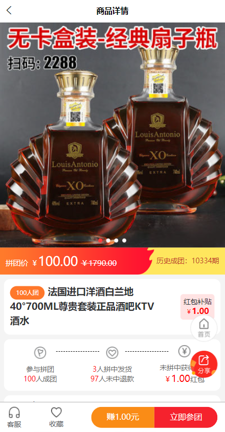 多人拼团,部分人获得得商品,没获得商品的人退款并瓜分红包,红包佣金从获得商品的人的订单利润里返。